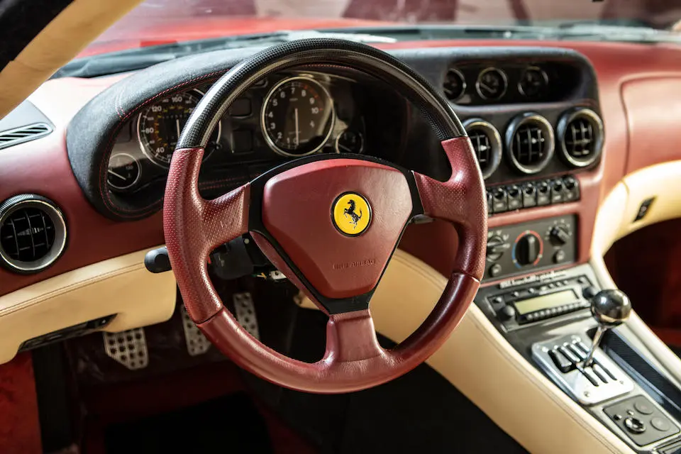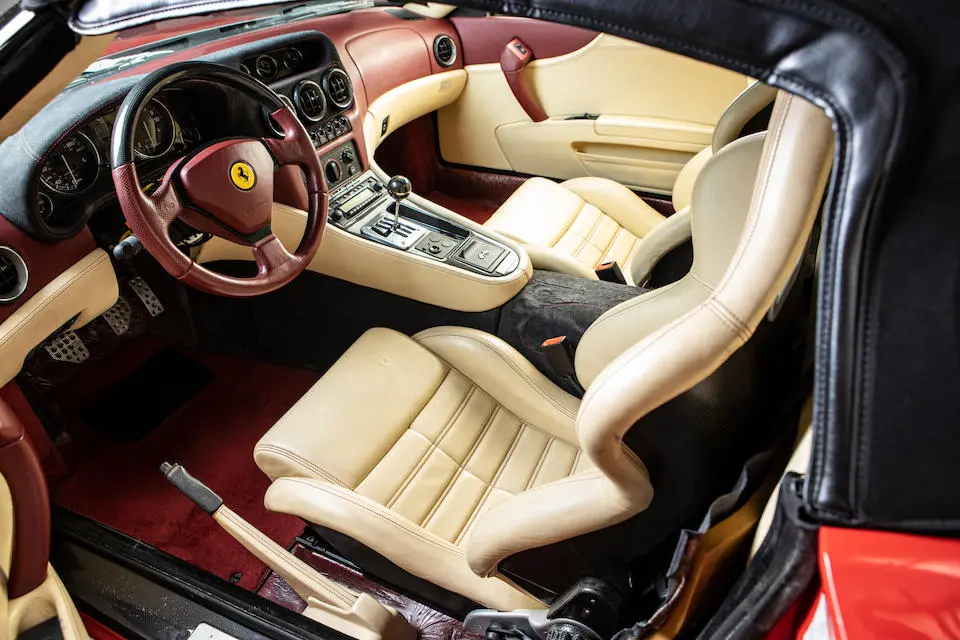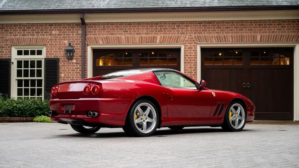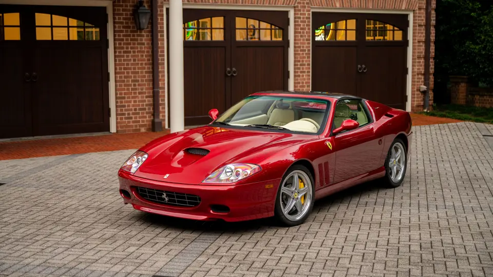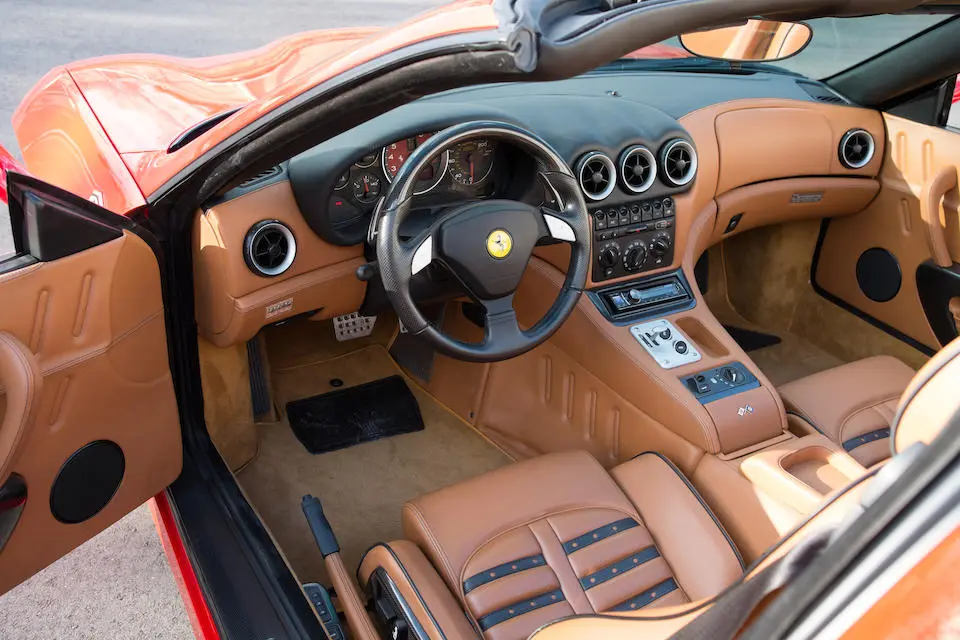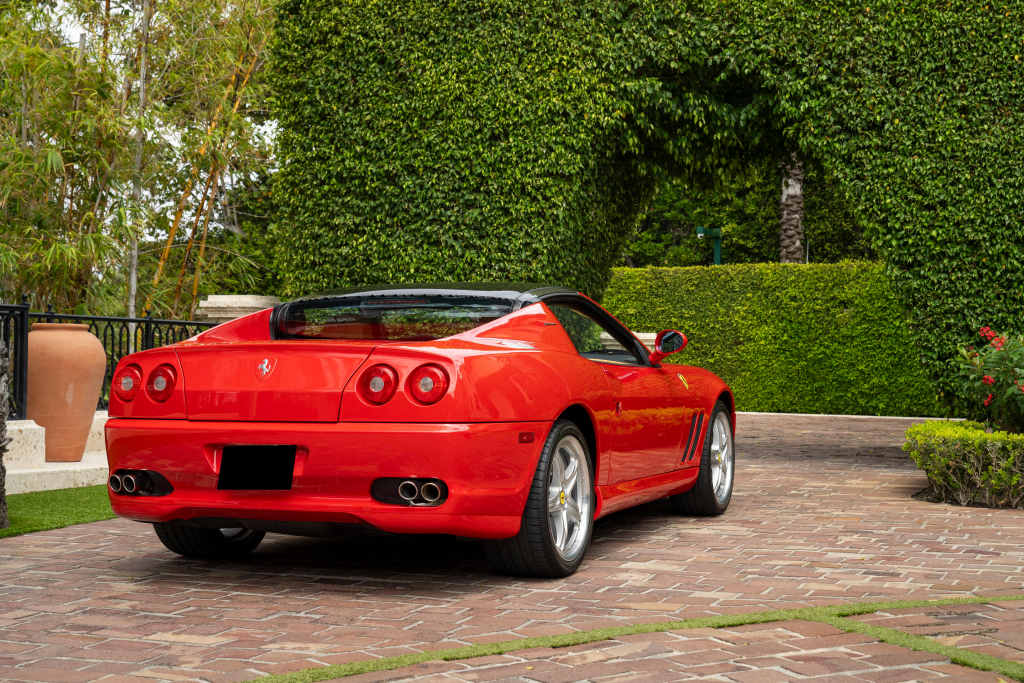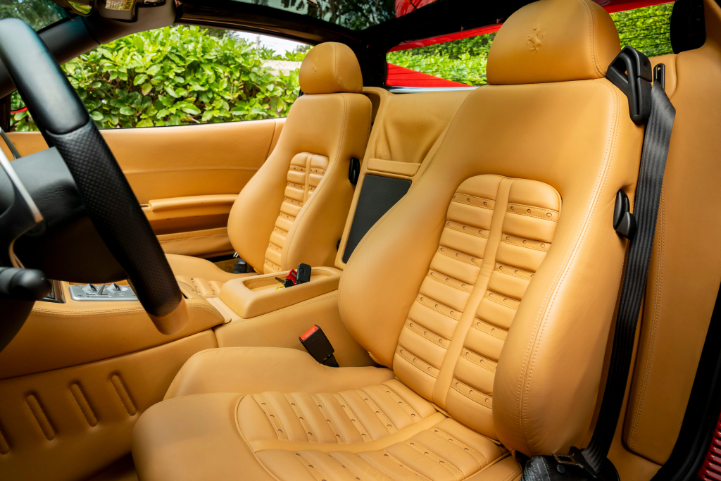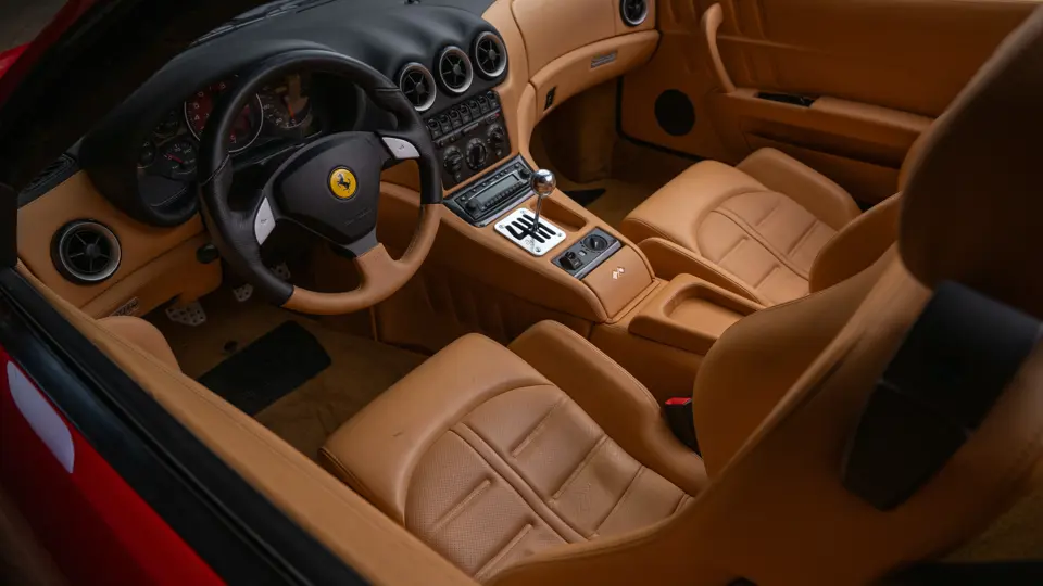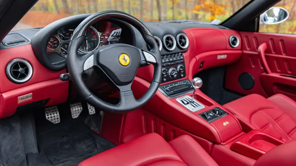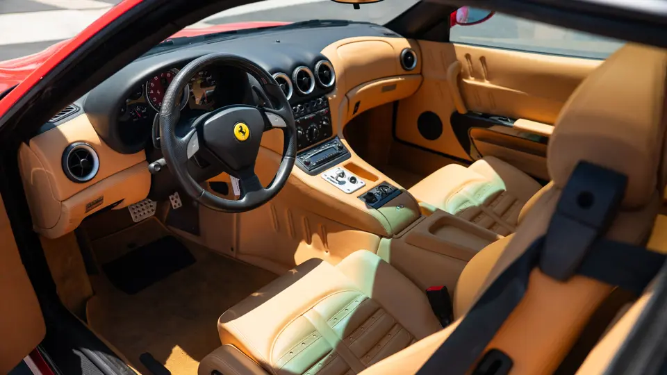 ZFFGT61A850142606 : 05/2005, 575 Super America, emblèmes Scuderia sur les ailes, Pack GTC (freins carbone céramique à étriers rouges, échappement titane, direction plus directe, jantes 19″), sièges Daytona, garnitures intérieures carbone, cloison pare-feu garnie cuir, Rosso Corsa, cuir beige.