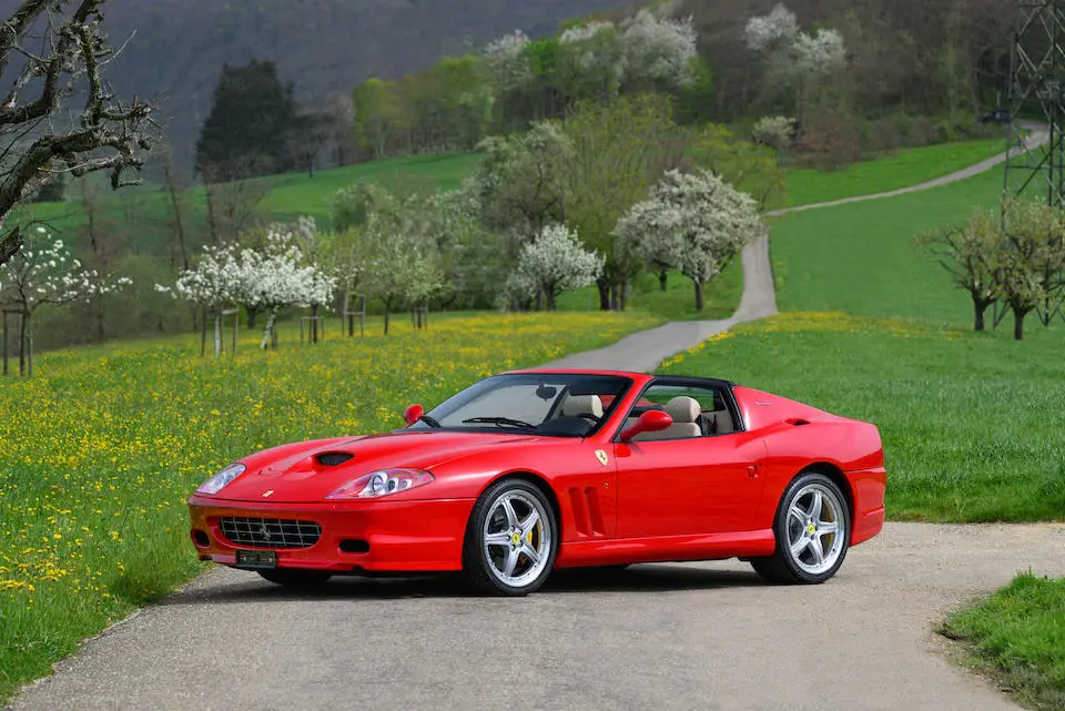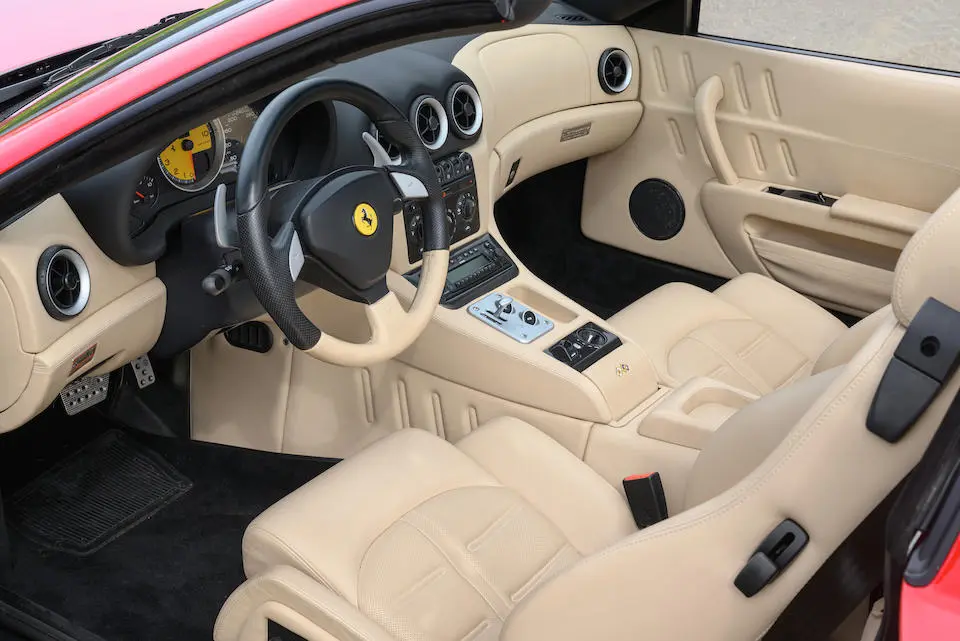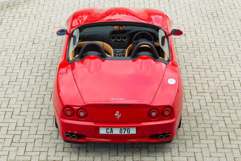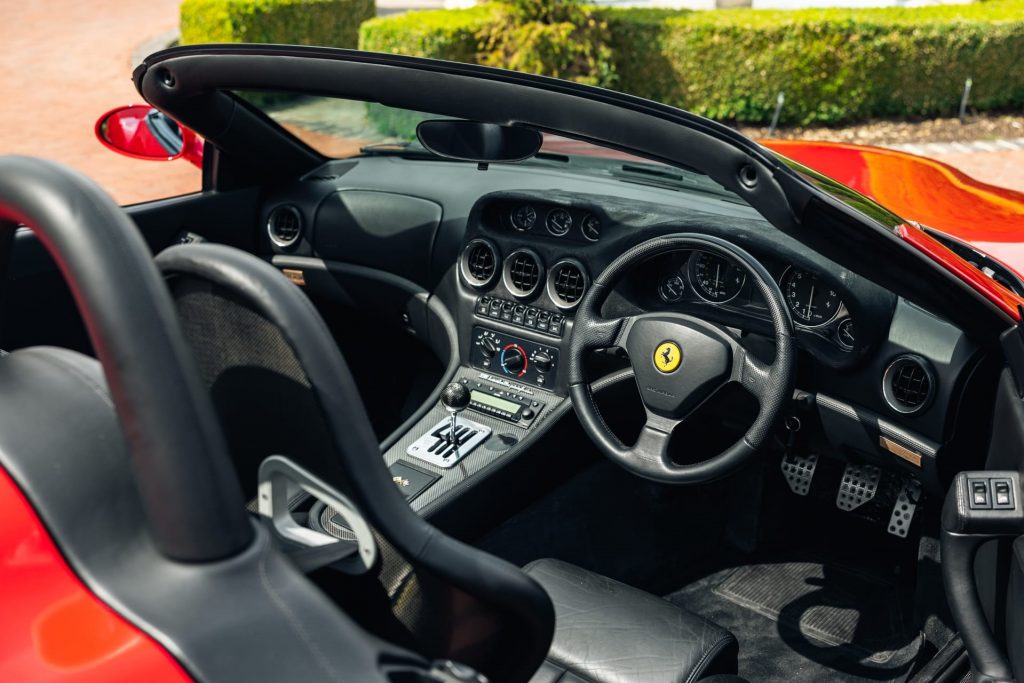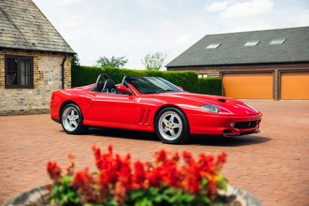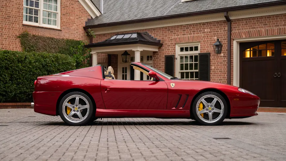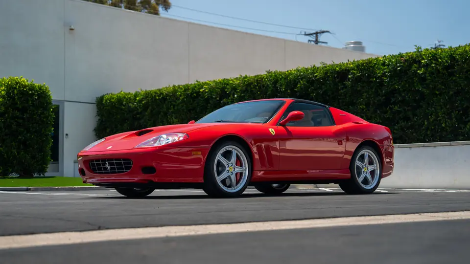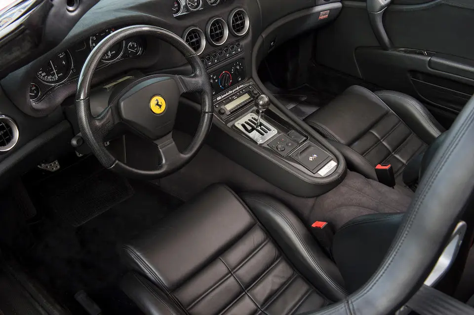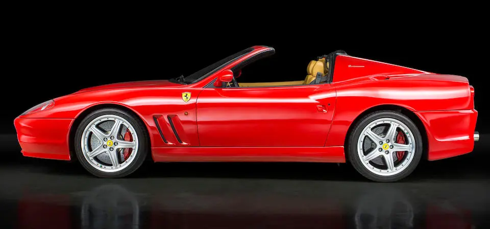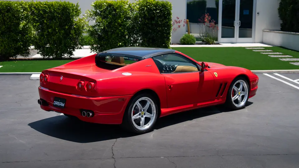 ZFFGT61A850142606 : 05/2005, 575 Super America, emblèmes Scuderia sur les ailes, Pack GTC (freins carbone céramique à étriers rouges, échappement titane, direction plus directe, jantes 19″), sièges Daytona, garnitures intérieures carbone, cloison pare-feu garnie cuir, Rosso Corsa, cuir beige.