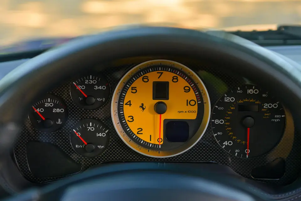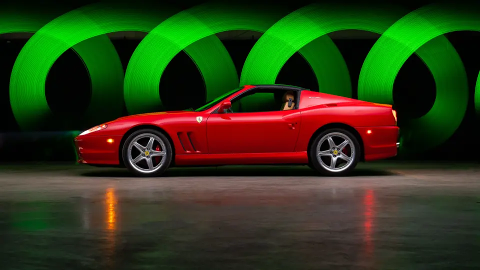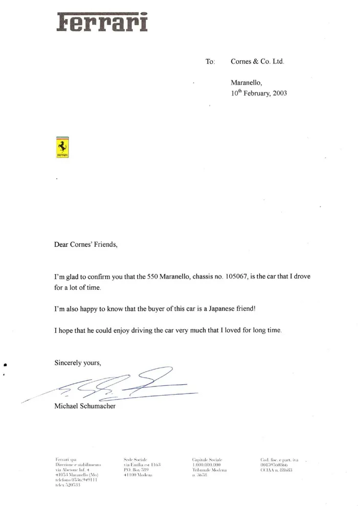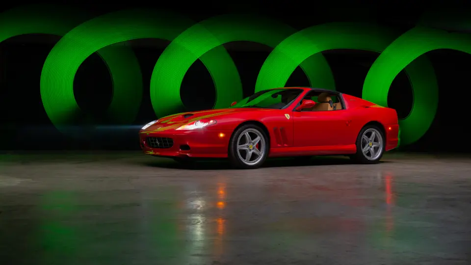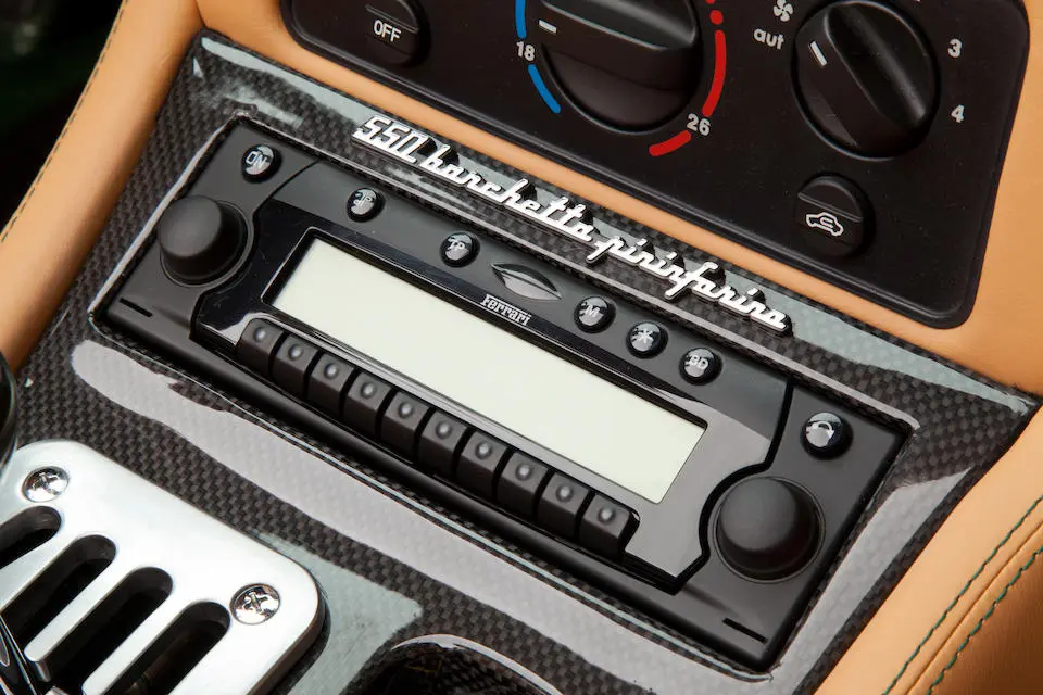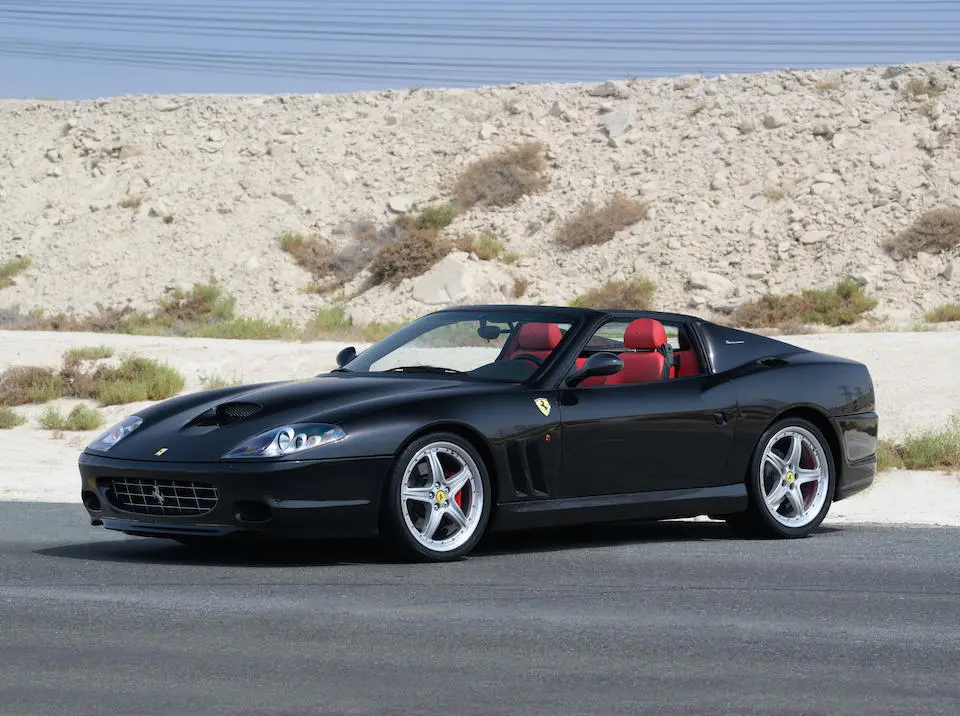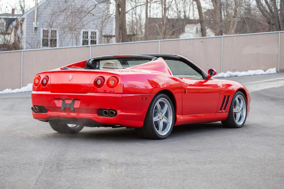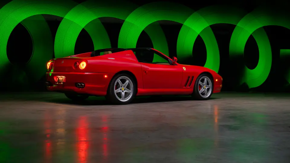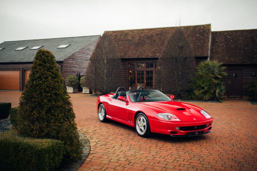 ZFFGT61A850142606 : 05/2005, 575 Super America, emblèmes Scuderia sur les ailes, Pack GTC (freins carbone céramique à étriers rouges, échappement titane, direction plus directe, jantes 19″), sièges Daytona, garnitures intérieures carbone, cloison pare-feu garnie cuir, Rosso Corsa, cuir beige.