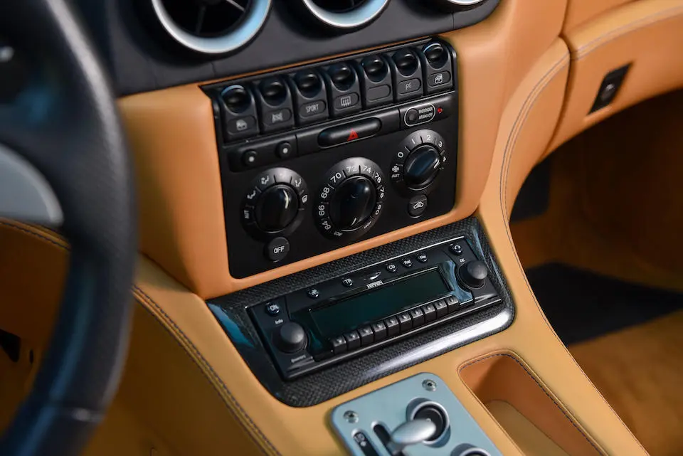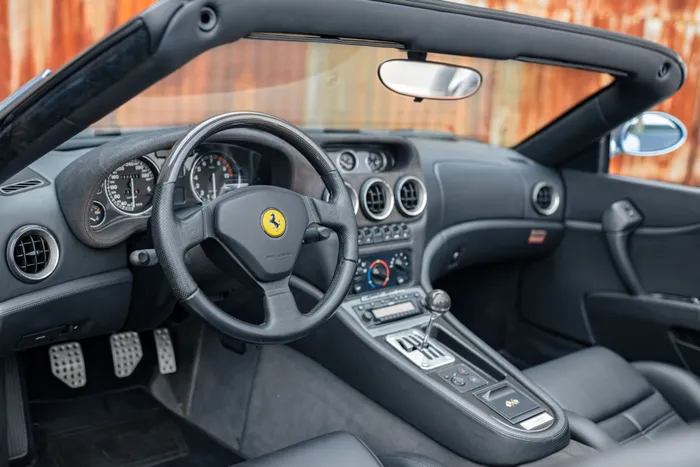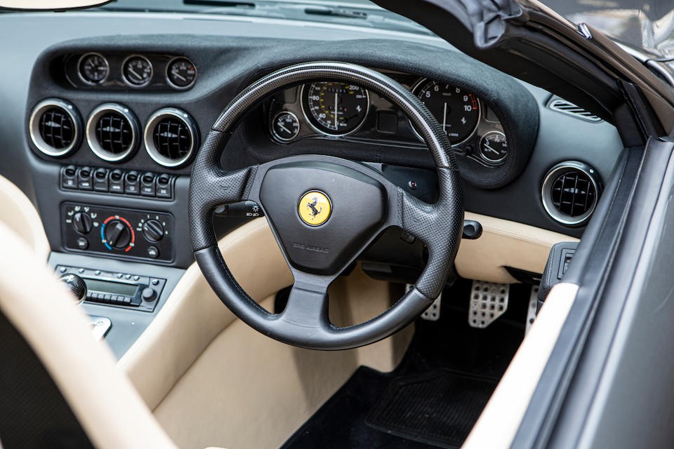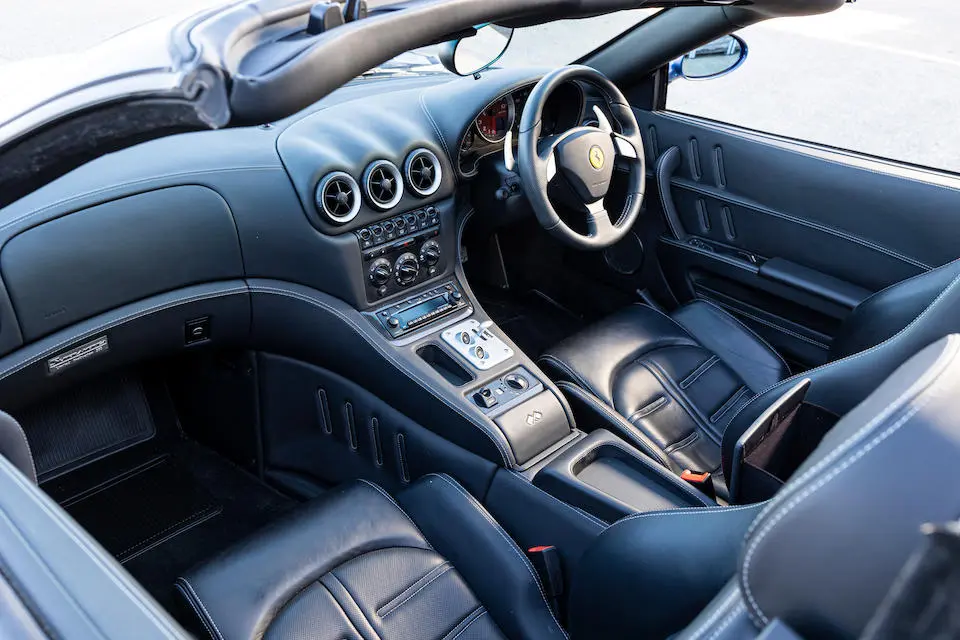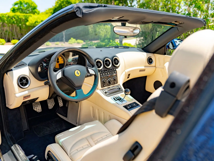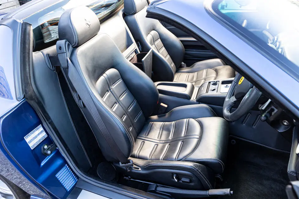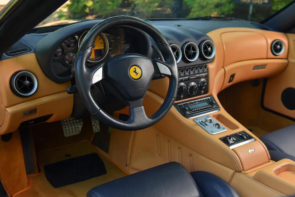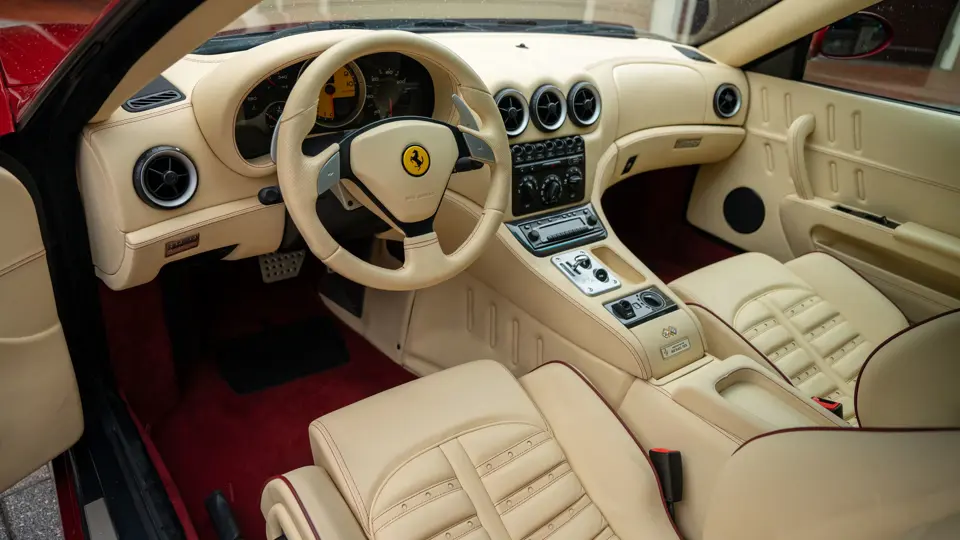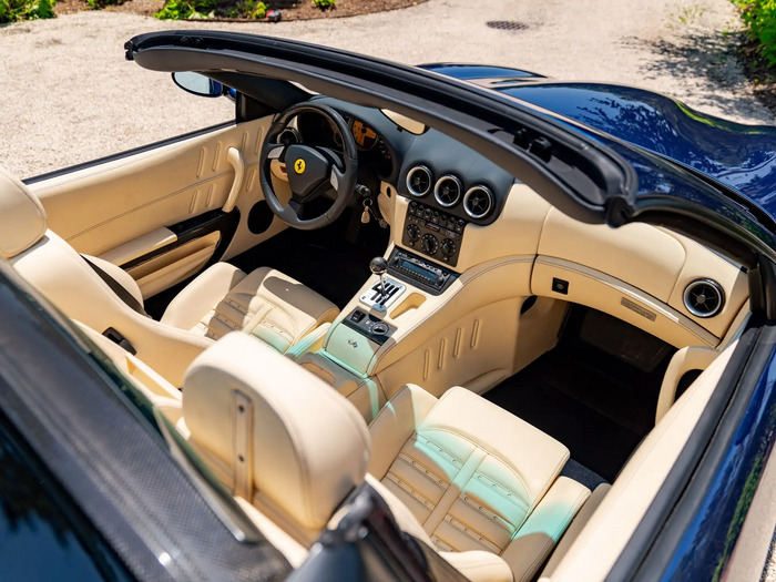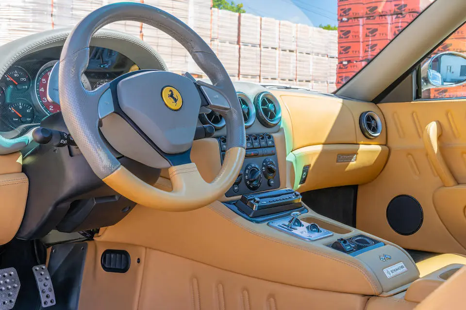 ZFFGT61A650144855 : 2005, 575 Super America, boîte de vitesses manuelle, écussons Scuderia sur les ailes, équipement hifi avec chargeur 6 disques, inserts carbone dans l’habitacle, volant Blu Scurro, Blu Tour de France, cuir crème.