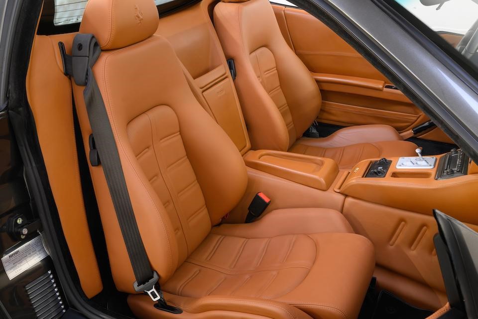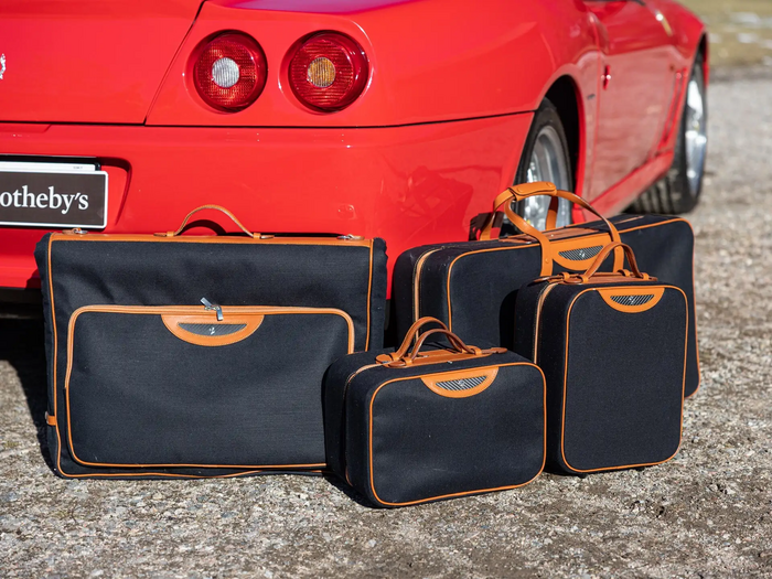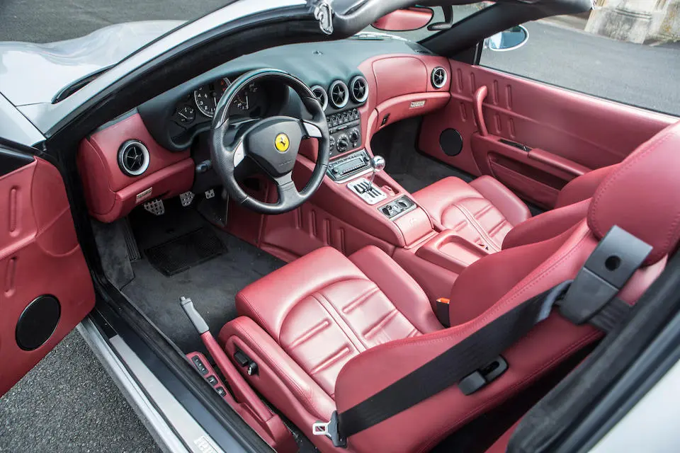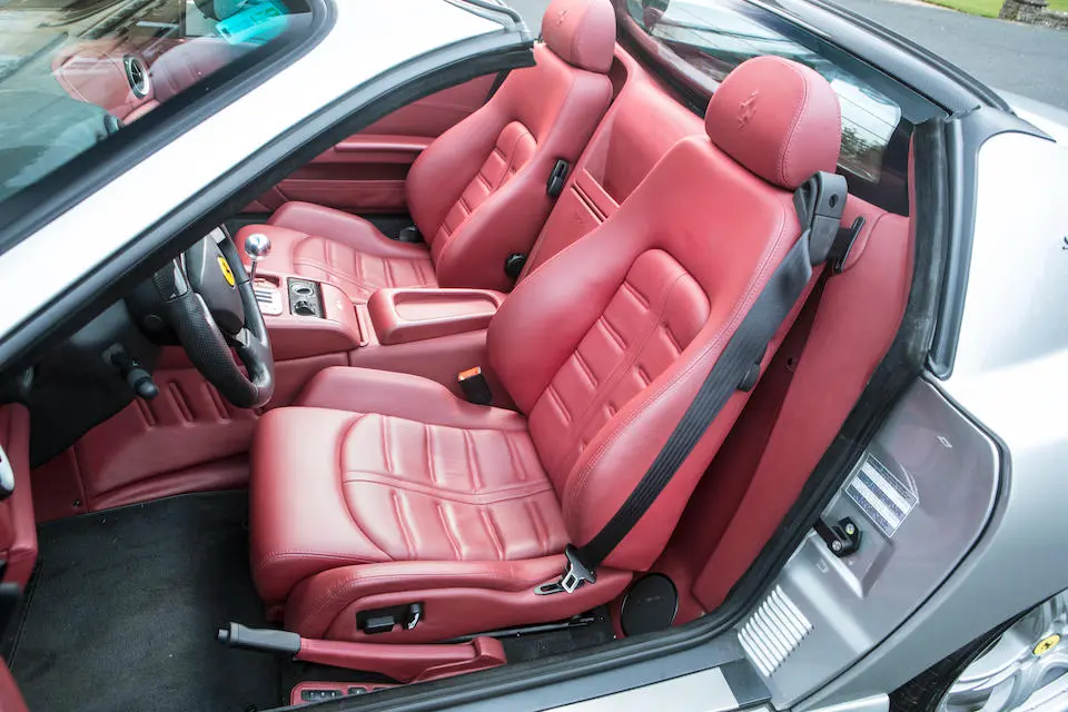 ZFFGT61B000145743 : 2005, 575 Super America, boîte de vitesses manuelle, goulotte couleur de la caisse, compteurs à fond noir (jaune/noir), coffre garni de carbone, package carbone pour l’habitacle mais contreportes en cuir, jeu de bagages Schedoni, Grigio Nürburgring, cuir bordeaux.