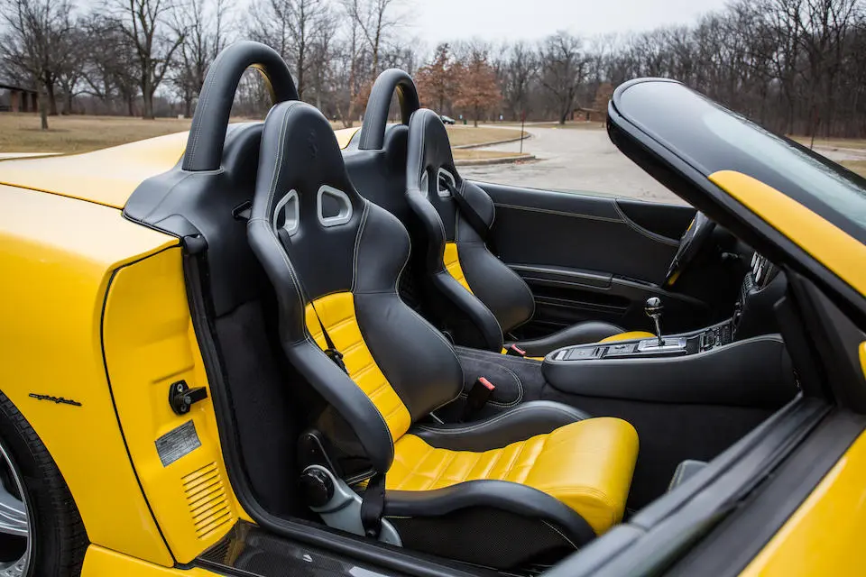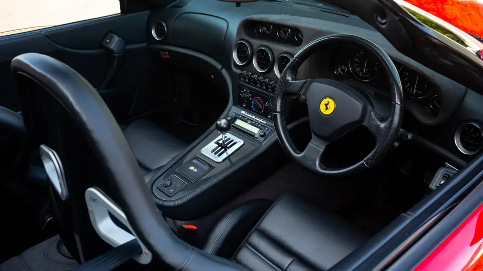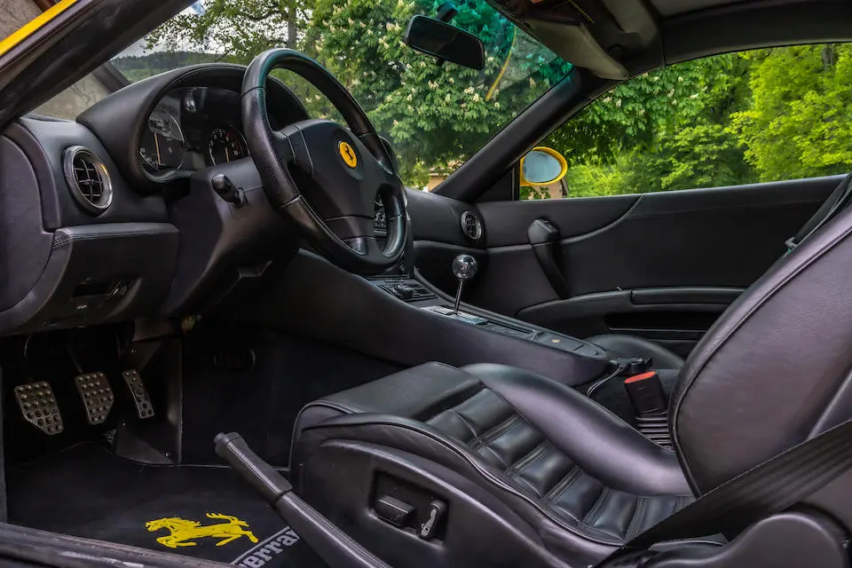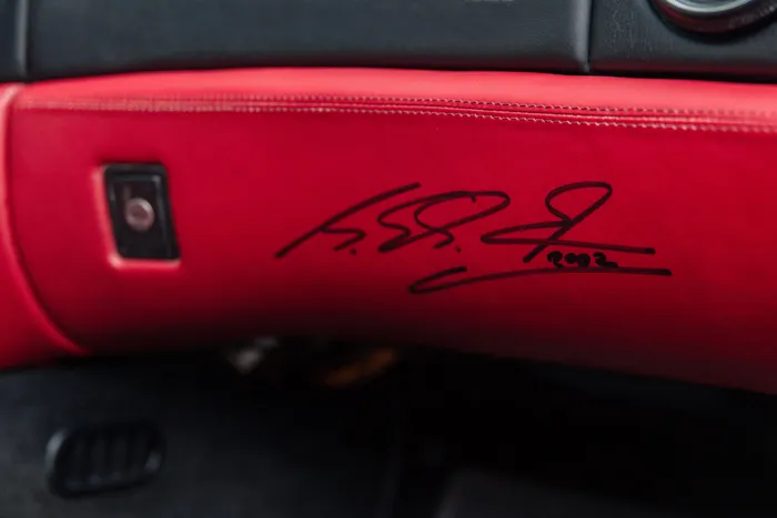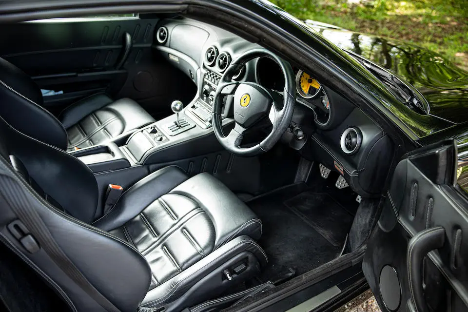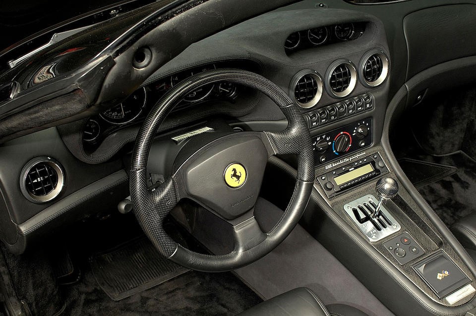 ZFFBT55C000130114 : 2003, 575 Maranello, CAD, moteur 71355, Gially Fly, cuir Nero Daytona, Kit Fiorano 2, Système de navigation par satellite, Carbon Pack (tableau de bord, garnitures de portières, console centrale, seuils de porte, palettes du volant, sièges), Système hifi avec caisson de basses, plage arrière garnie de cuir, étriers de freins peints en jaune, écussons SF sur les ailes, échappement Tubi, chargeur de batterie dans son étui en cuir.