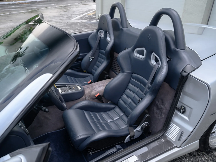 ZFFGT61A550143793 : 2005, 575 Super America, Boîte de vitesses manuelle (1/43), étriers rouges, sigles Scuderia Ferrari sur les ailes avant, cloison pare-feu garnie cuir, tavchymètre à fond jaune, sièges Daytona, Argento Nürbürgring, cuir Grigio Scuro à passepoils charbon.