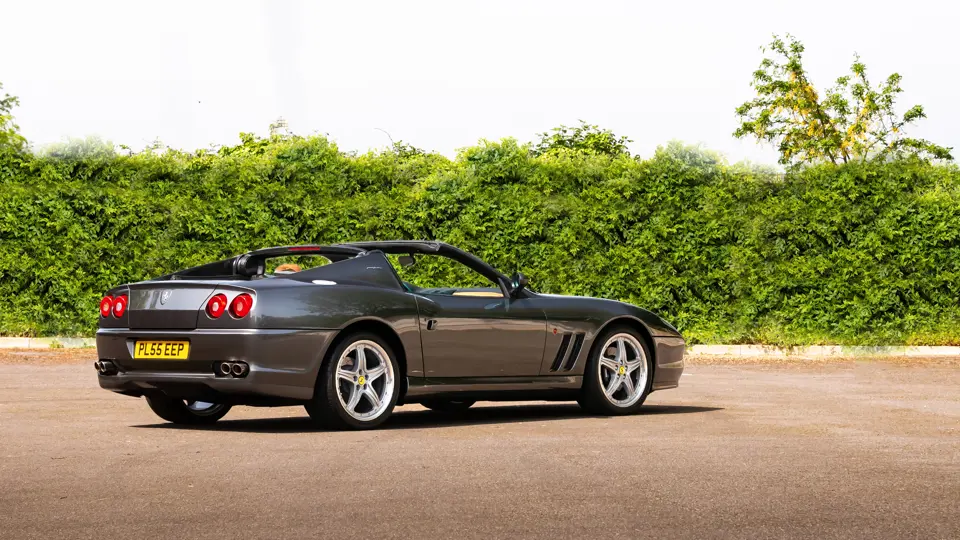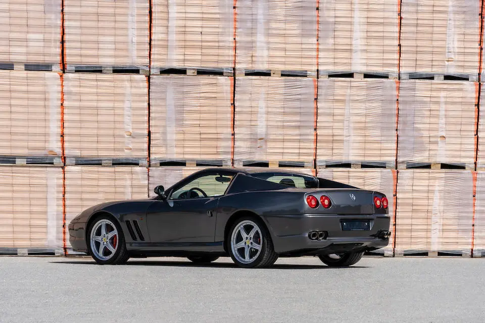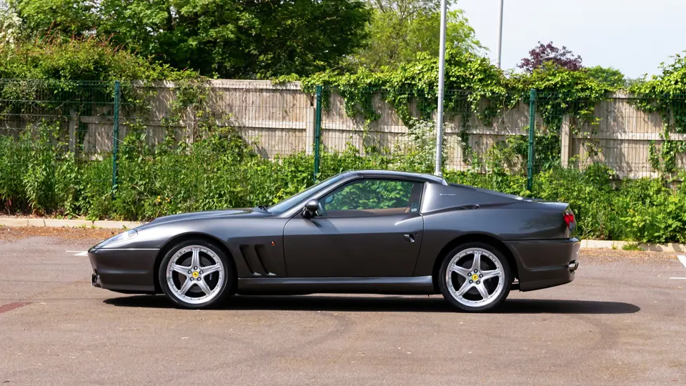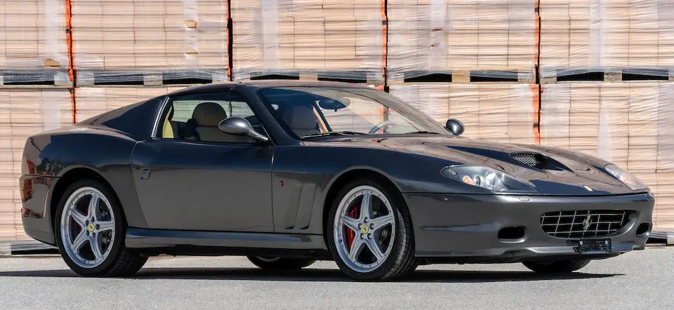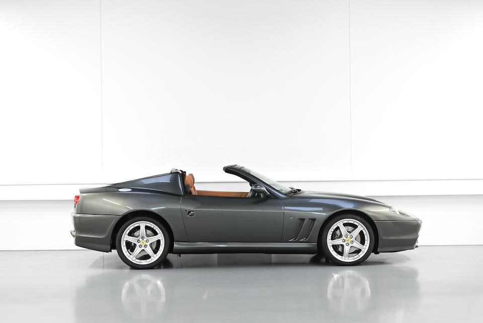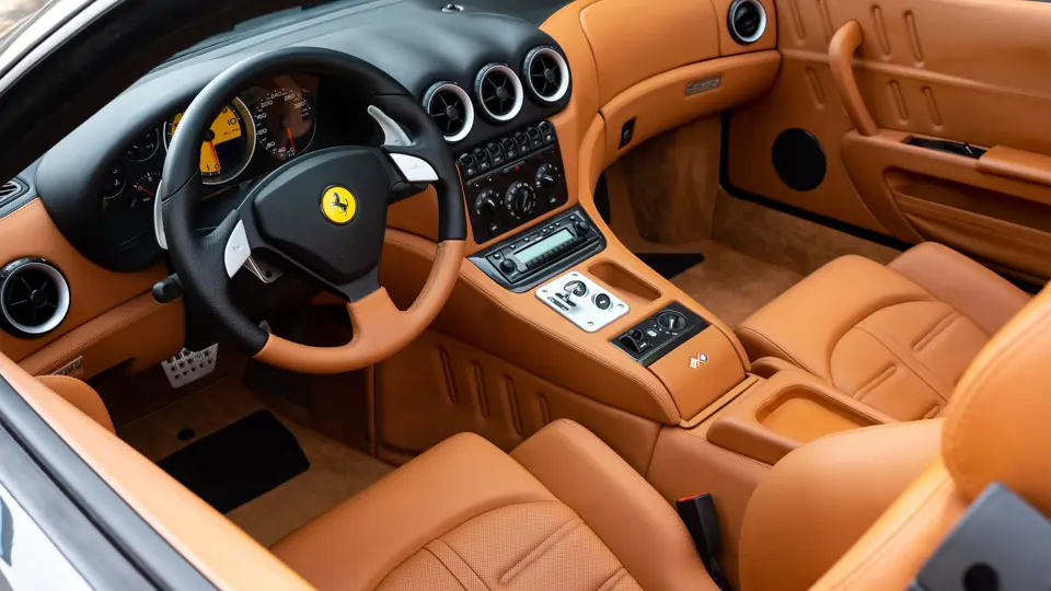 ZFFGT61A650142605 : 2005, 575M Superamerica, emblèmes Scuderia sur les ailes, boîte de vitesses F1, étriers aluminium, installation Hifi, Package Fiorano, sièges Daytona beige/noir, Grigio Titanio, cuir beige.