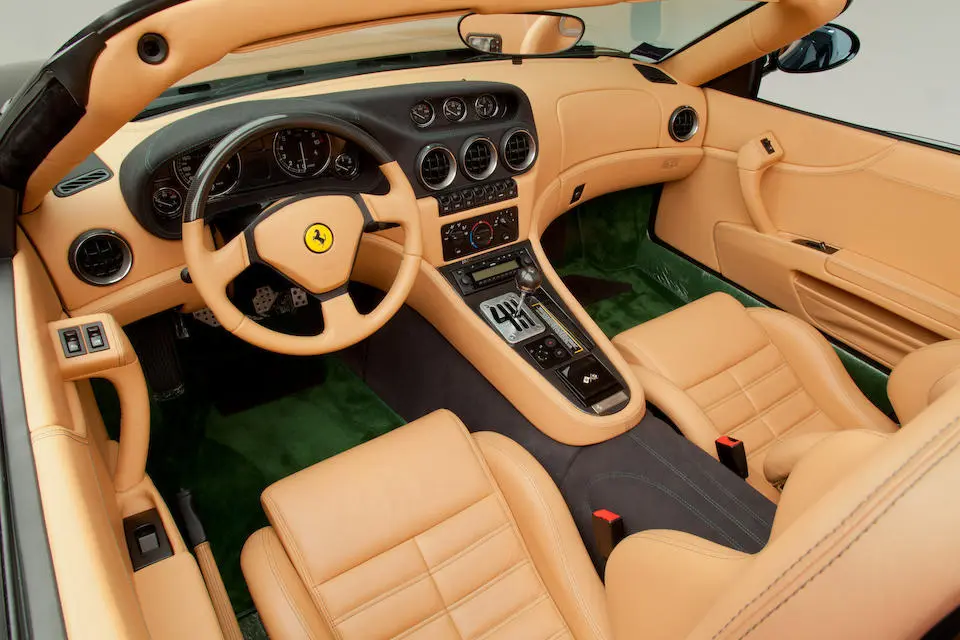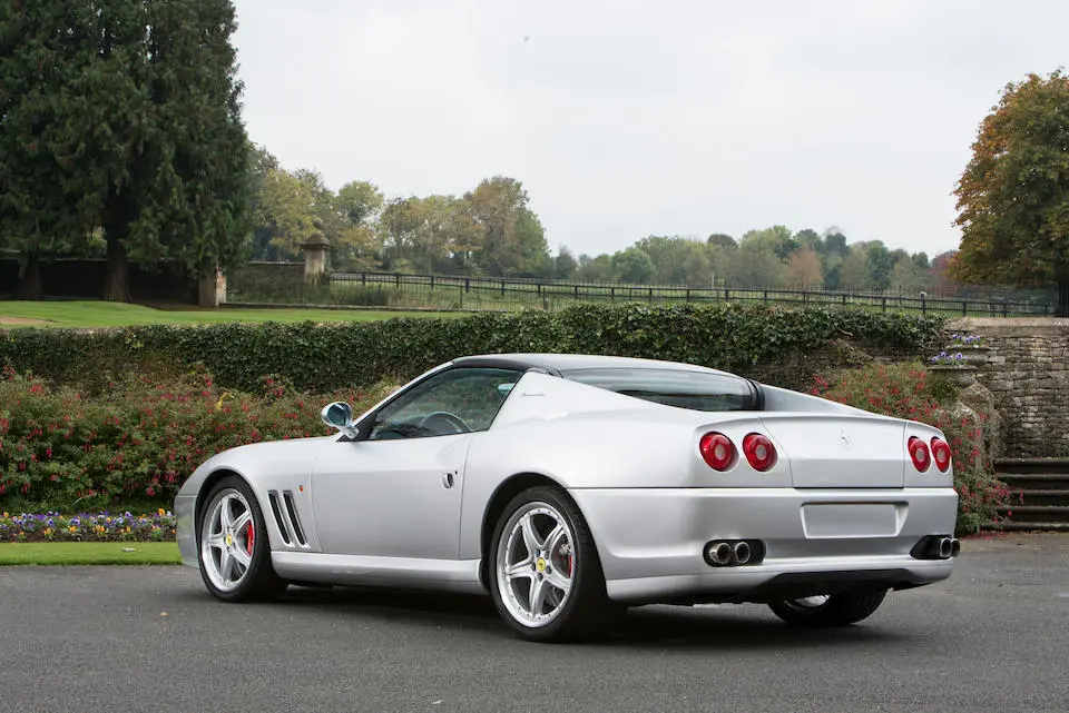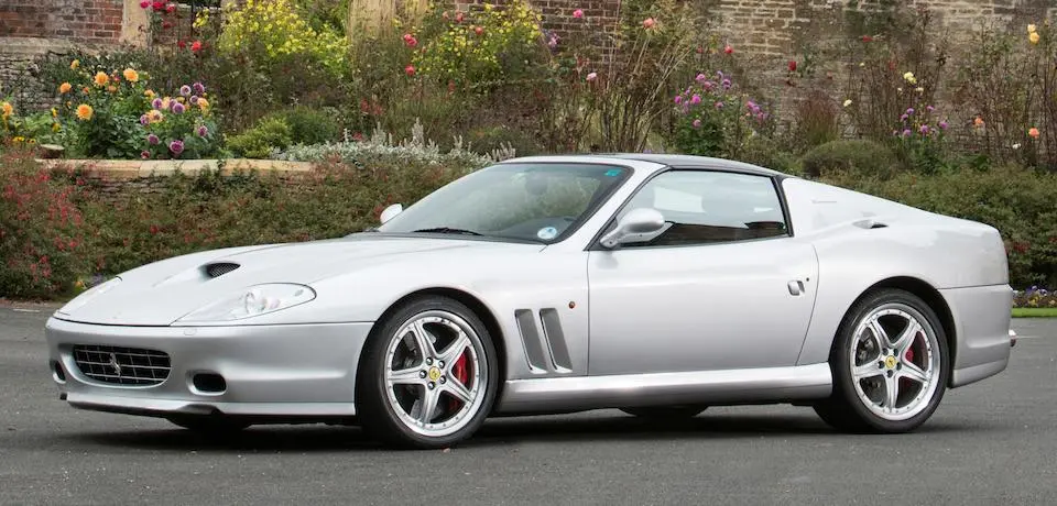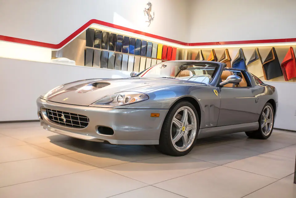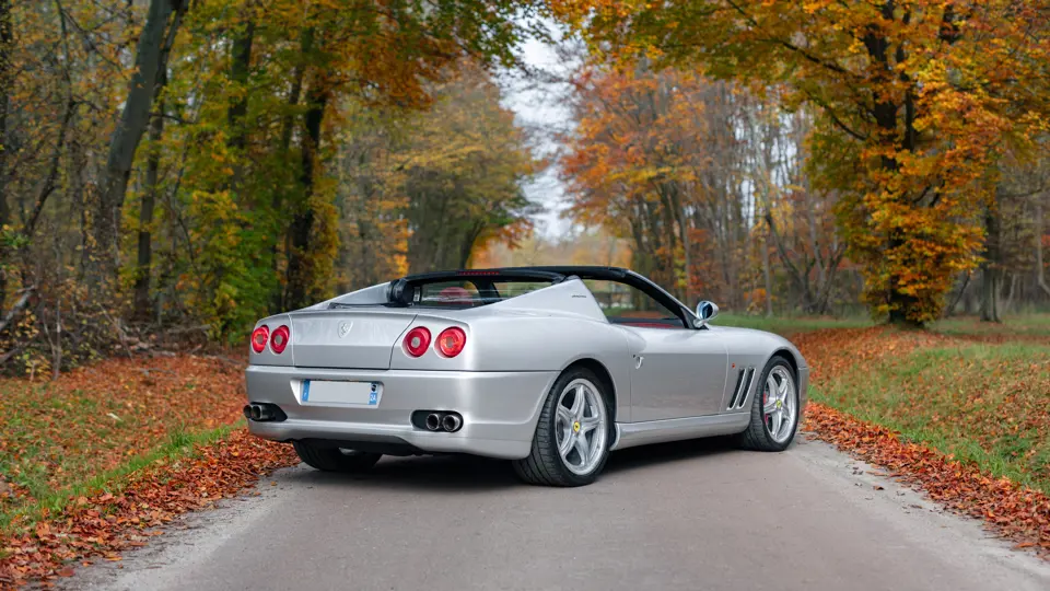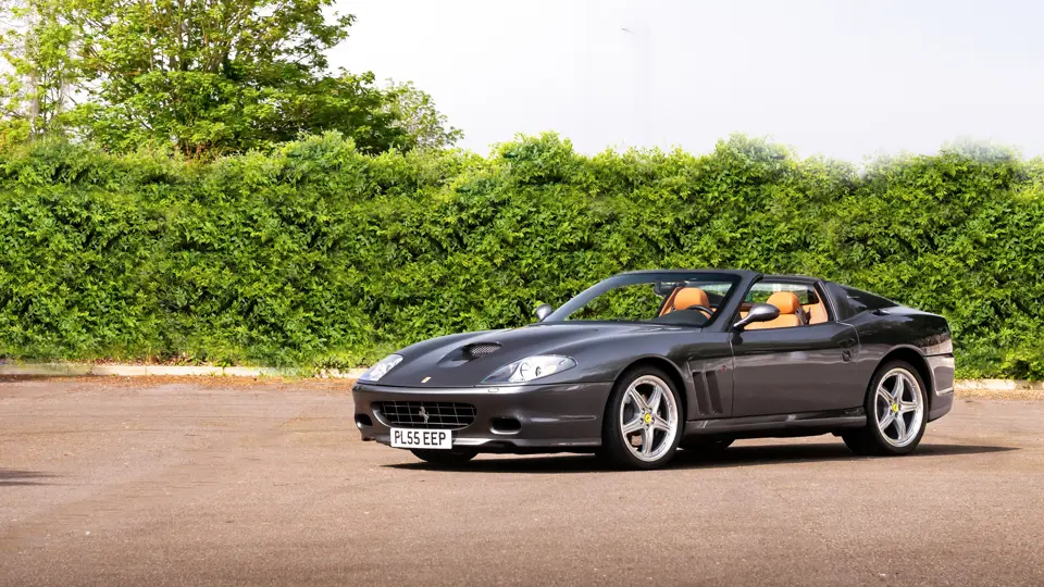 ZFFGT61A650142605 : 2005, 575M Superamerica, emblèmes Scuderia sur les ailes, boîte de vitesses F1, étriers aluminium, installation Hifi, Package Fiorano, sièges Daytona beige/noir, Grigio Titanio, cuir beige.