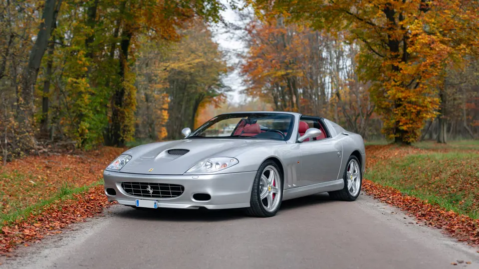 ZFFGT61B000145743 : 16/12/2005, 575 Super America, boîte de vitesses manuelle (1/43), freins carbone-céramique, étriers rouge, direction plus directe, échappement titane, goulotte de remplissage d’essence couleur caisse (aluminium poli), tableau de bord et volant carbone, Argento Nürburgring, cuir Bordeaux.