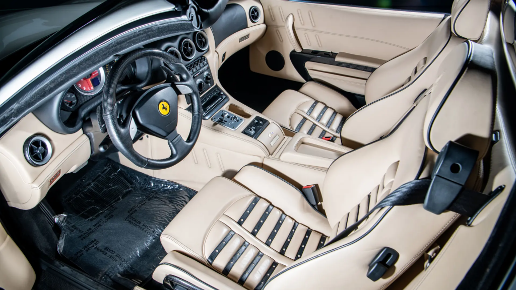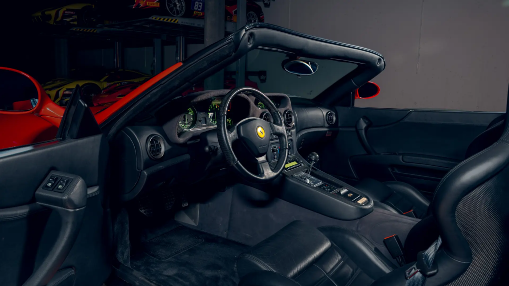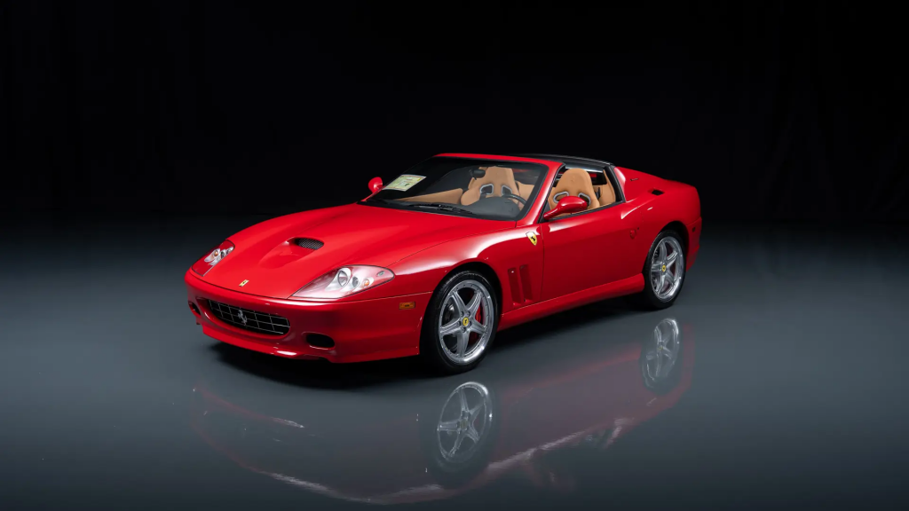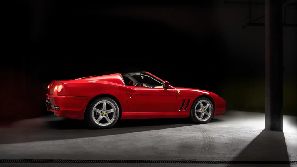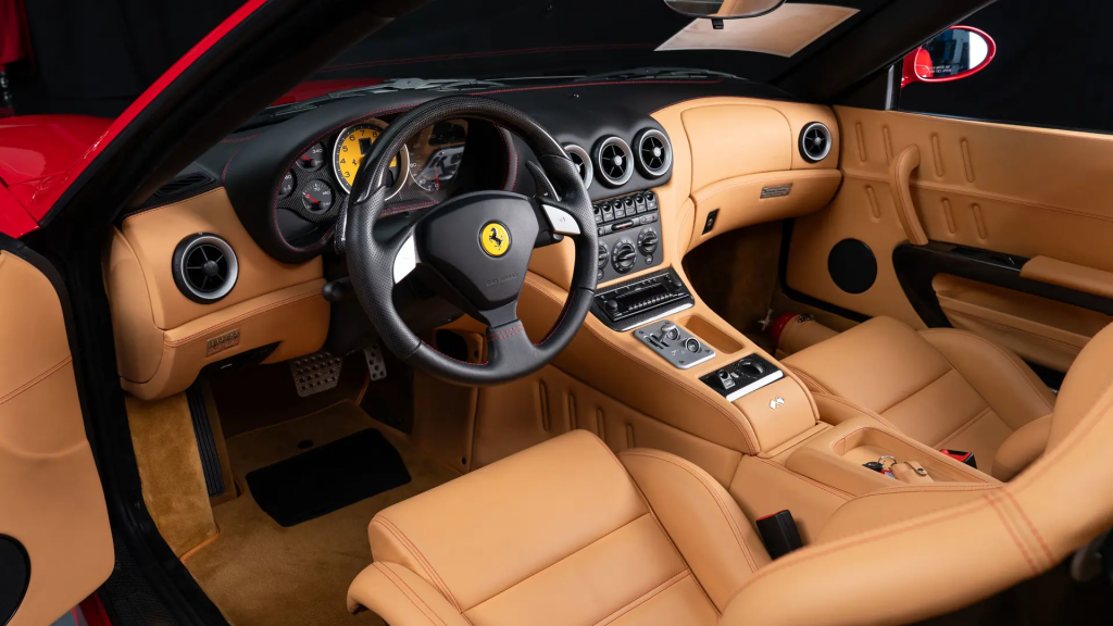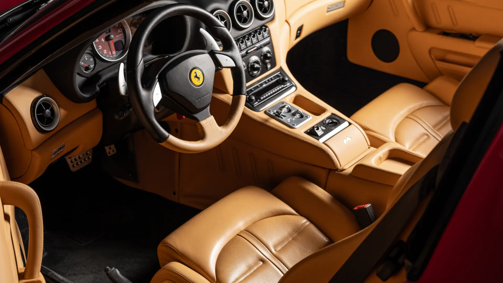 ZFFGT61A650144855 : 2005, 575 Super America, boîte de vitesses manuelle, écussons Scuderia sur les ailes, équipement hifi avec chargeur 6 disques, inserts carbone dans l’habitacle, volant Blu Scurro, Blu Tour de France, cuir crème.