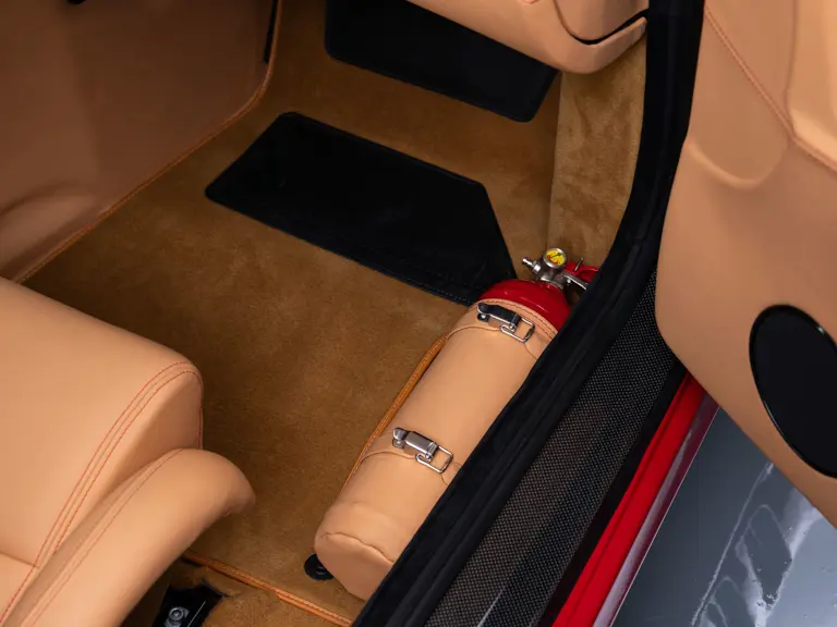 ZFFGT61A850143108 : 2005, 575 Super America; Package GTC : suspensions sport, disques carbone-céramique, échappement libéré, jantes 19″ ; espace bagages, arceaux, console centrale, rangement d’extincteur en cuir beige; extincteur Handly, système de navigation, système audio avec chargeur CD 6 disques, Rosso Corsa, cuir beige à passepoils rouges.