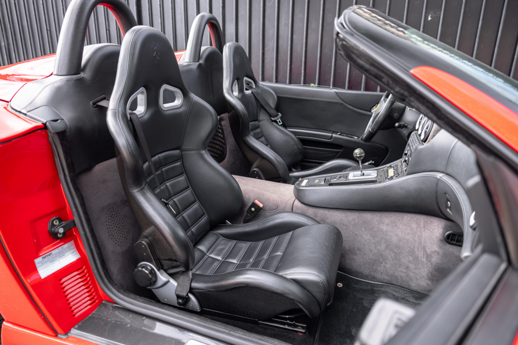 F133-GT-1436558 : 1996, 550 Sperimentale, empattement rallongé de 20 cm, 2 traverses supplémentaires (rigidité augmentée de 10%), prise d’air sur aile ARD pour créer une dépression sous la voiture destinée à refroidir le réservoir d’essence (augmente puissance et diminue émissions polluantes), échappement latéral de plus gros diamètre, ailes avant et capot plus long, ensemble pédalier-volant entièrement réglable, individuellement pour chaque pédale, siège conducteur fixe, Rosso Corsa.