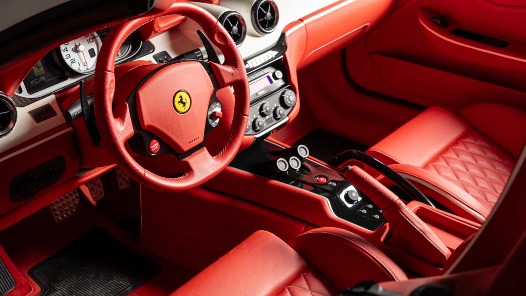 ZFF72RDB000184568 : 2012, SA Aperta, moteur 180940, boîte de vitesses 1057, écussons Scuderia sur les ailes, sièges finition sellier, Blu Pozzi, inserts Bianco Avus, cuir Rosso, inserts Bianco.