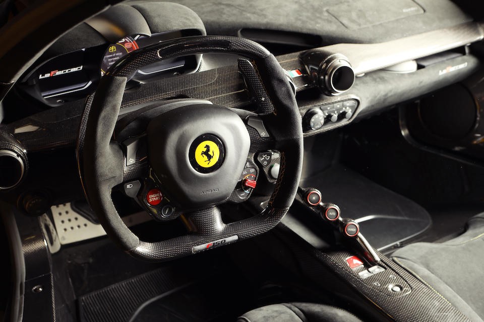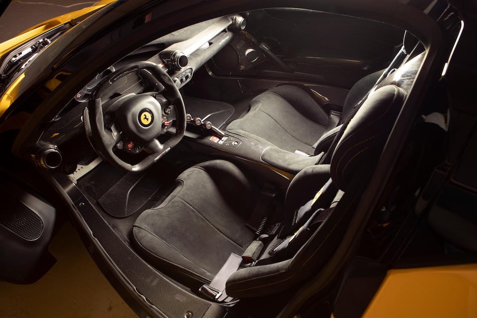 L’habitacle reçoit un écran 12,3 pouces (310 mm) avec affichage de la télémétrie de la voiture (3 réglages possibles) et un volant style F1 intégrant les commandes de réglage du différentiel et le bouton-poussoir de démarreur. Tout l’agencement est défini par rapport à la position de conduite, abaissée de 6 cm par rapport à l’Enzo. Le pilote est ainsi assis dans des sièges réalisés à même la structure et non plus fabriqués séparément et fixés sur le plancher, le pédalier et la colonne de direction sont réglables.