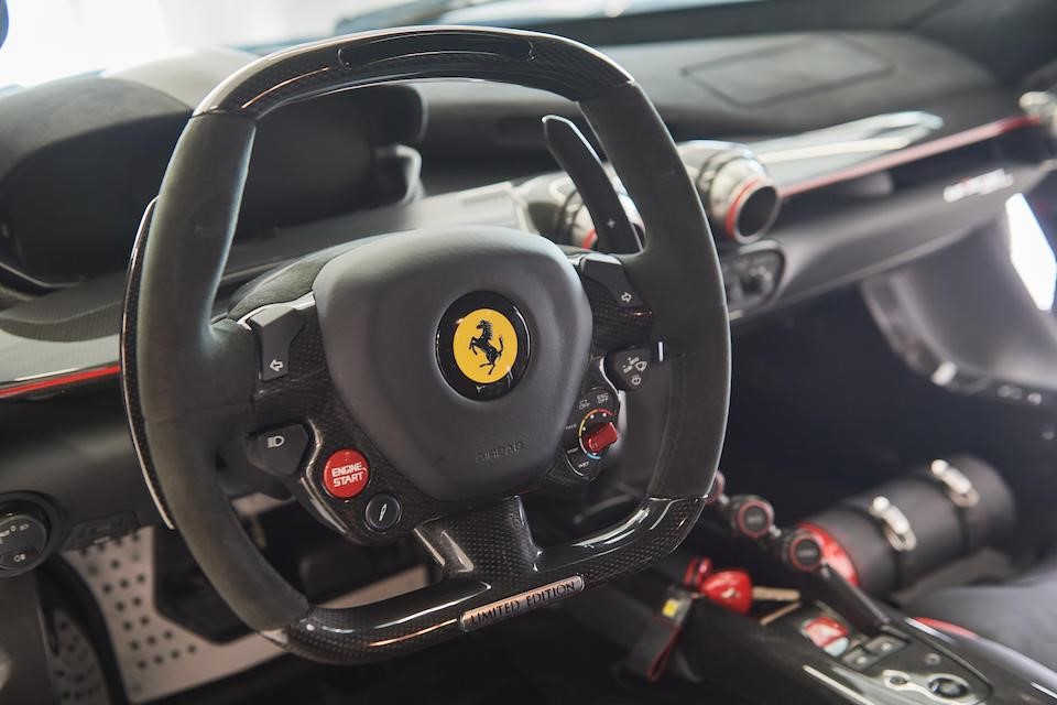 ZFF86ZHAXH0227678 : 2017, Aperta, éléments de carrosserie en carbone, étriers de frein jaunes, embouts d’échappement racing, jantes noires 20 pouces en acier forgé, garde au sol réglable à l’avant, sièges plus larges, cavallino brodé sur les appuie-têtes, Giallo Triplo Strato, cuir noir avec inserts jaunes.