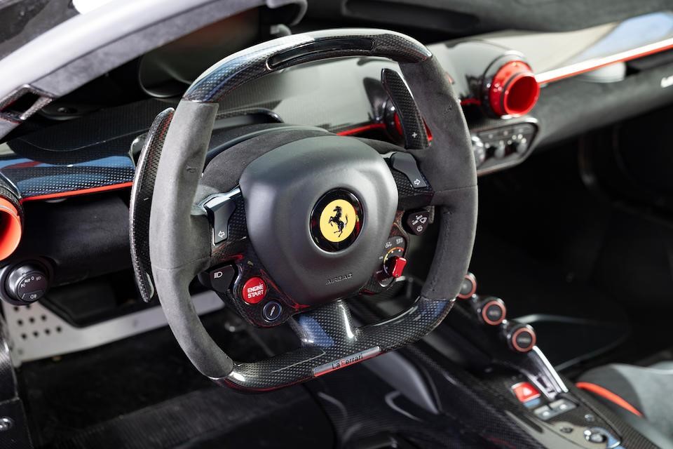 ZFF76ZHB000214218 : 2016, LaFerrari, jantes aluminium forgé à 5 bâtons grises, étriers noirs, cric hydraulique, système de télémétrie course, caméras de recul, Cavallino brodé sur les appuie-tête, système audio, plaque F150 sur le volant, Vinacia, Pelle Chiodi Di Garofano, déflecteur avant, bas de caisses et diffuseur arrière noir satiné.