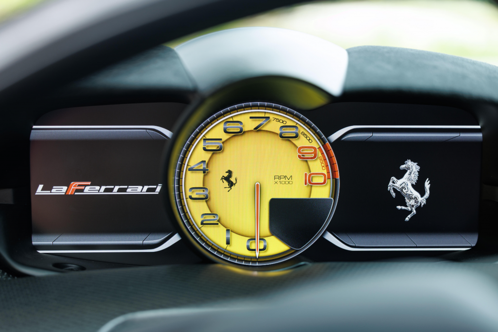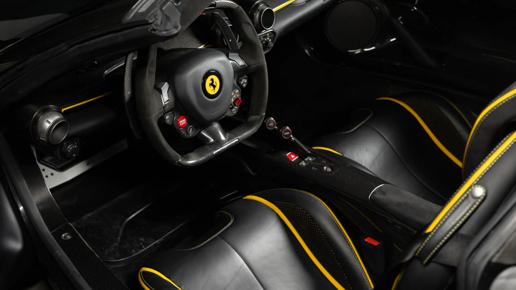 ZFF76ZFA9F0211998 : 2015, LaFerrari, jantes noires, étriers jaunes, embouts d’échappement noirs ; rétroviseurs extérieurs, diffuseurs av./arr., coque de feux antibrouillards carbone, télémétrie avec caméras, sièges confort, Nero, cuir Nero.