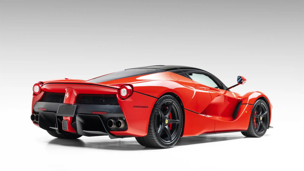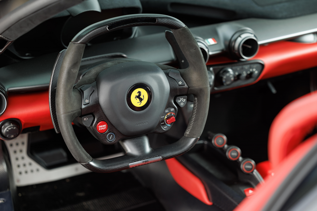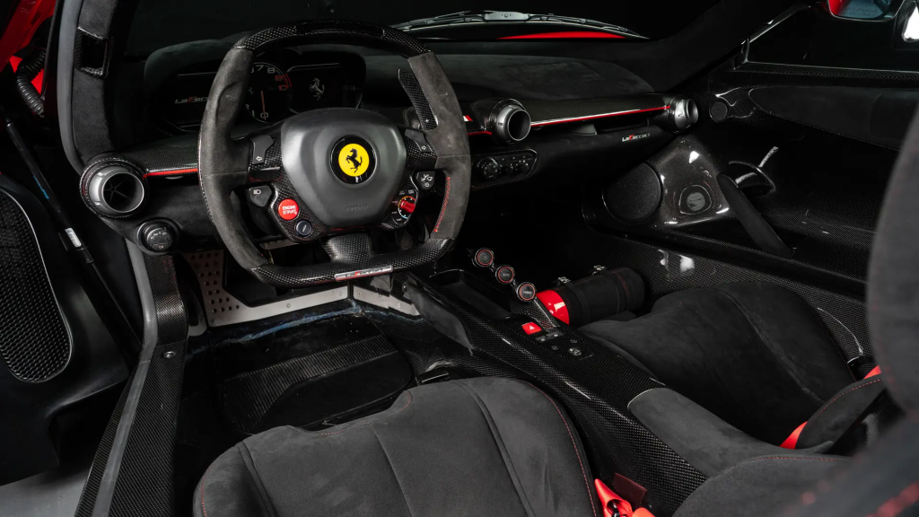 ZFF76ZFA0F0211999 : 2015, LaFrerrari, inserts carbone noir mat, cabochons de roues carbone, tableau de bord carbone, emblèmes brodés dans les appuie-têtes, Rosso Corsa, intérieur Nero à passepoils et inserts Rosso.