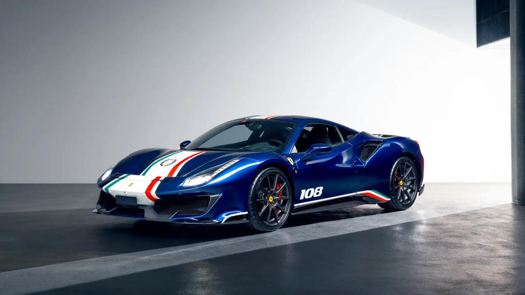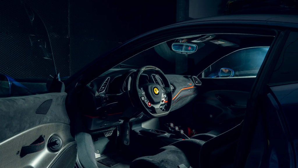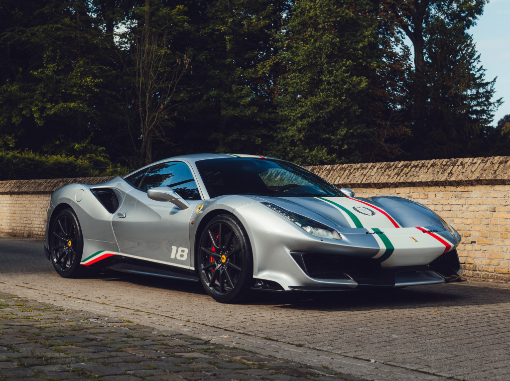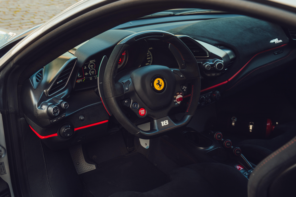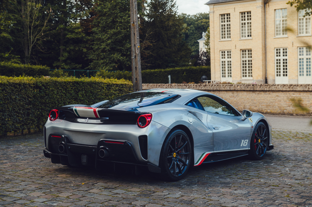 ZFF90HMB000253118 : 2020, 488 Pista Piloti, pack carbone extérieur (diffuseur av./arr., prises d’air, pare-chocs arrière, couvres-culasses), jantes 20″ fibre de carbone, échappement titane, système de levage av., rétroviseurs électrochromes, bande tricolore, n° de course 18, pack carbone mat intérieur (tableau de bord, console, seuils de portes, compartiment bagages), Cavallino brodé sur les appuie-têtes, système de télémétrie, kit caméra Track, extincteur, compte-tours à fond blanc, sièges racing Medium, harnais 4 points, Apple Car Play, système hifi Hi-Power, navigation avec Bluetooth, caméra de recul arr., Argento Nürburgring (101/C), alcantara Nero (9440) à passepoils Rosso (0504)