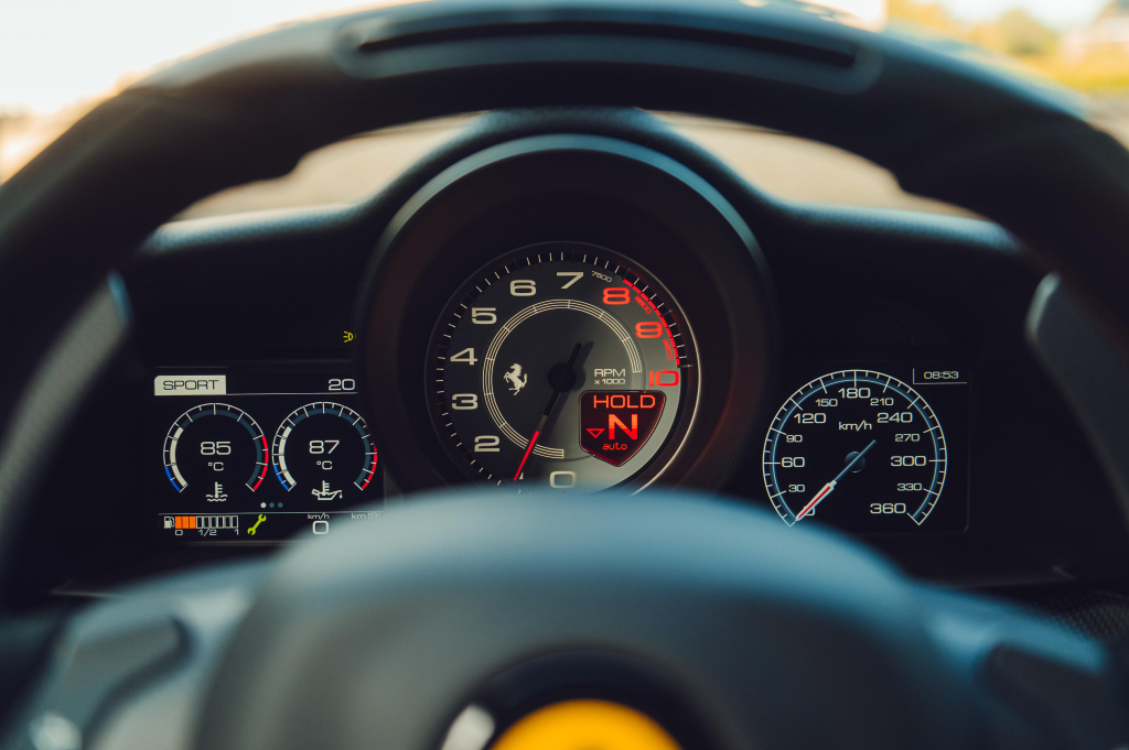 ZFF90HMB00025381 : 2020, 488 Pista, jantes forgées, étriers jaunes, phares adaptatifs, lift de la partie av., écussons sur les ailes, kit carbone, caméra de recul, sièges baquet carbone réglable pour le conducteur, logo brodé sur les appuie-têtes et les tapis de sol, Argento Nürburgring, bandes noires, alcantara gris, inserts jaunes.