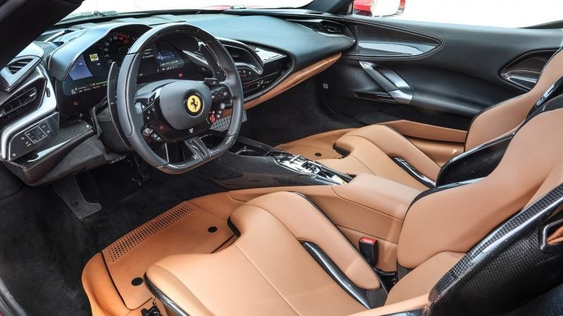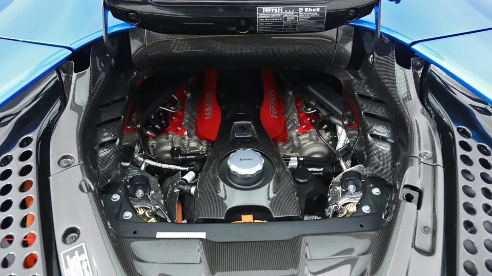 Moteur V8 thermique ouvert à 90° dérivé de la F8 Tributo, Tipo F154 qui passe à 4 litres. Bloc et culasses en alliage léger, bloc abaissé de 75mm, et allégé de 25 kg.