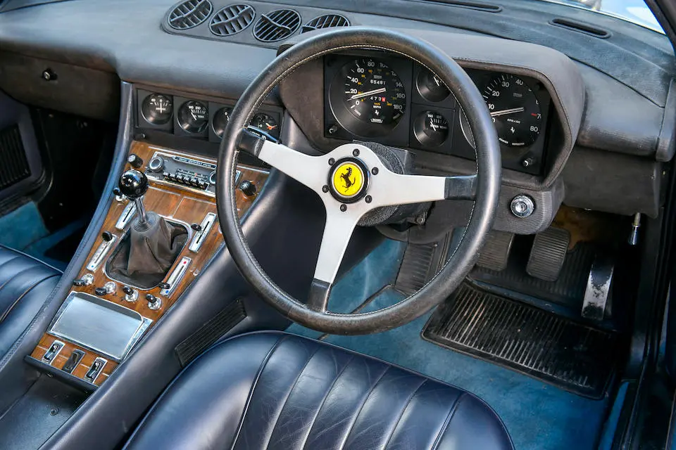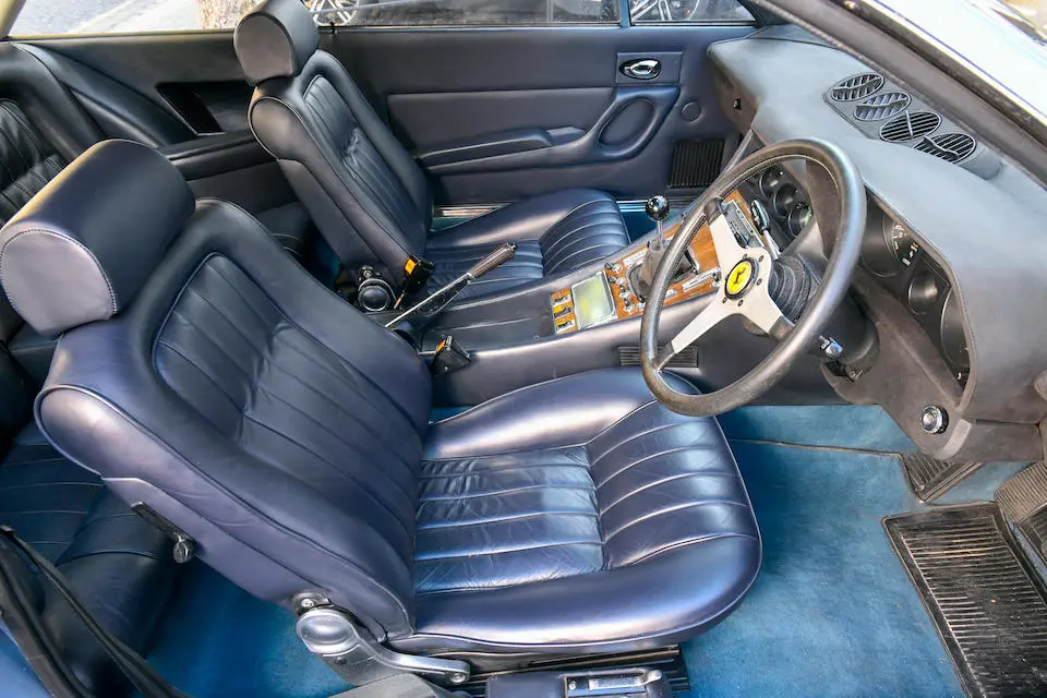 F 101 19709 : 1973, 365 GT 2+2, CAD, boîte de vitesses manuelle, Azzuro, cuir bleu.