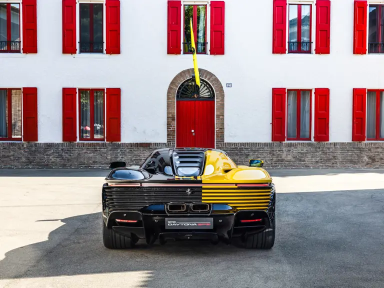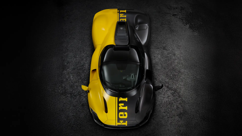 ZFF05UMA1S0319682 : 2025, SP3 Daytona, dernière de la série, intérieur Taylor Made : revêtement à partir de pneus recyclés, écussons brodés dans les appuie-têtes, volant alcantara, Noire/Giallo Modena (Taylor Made).
