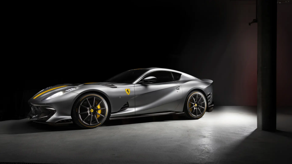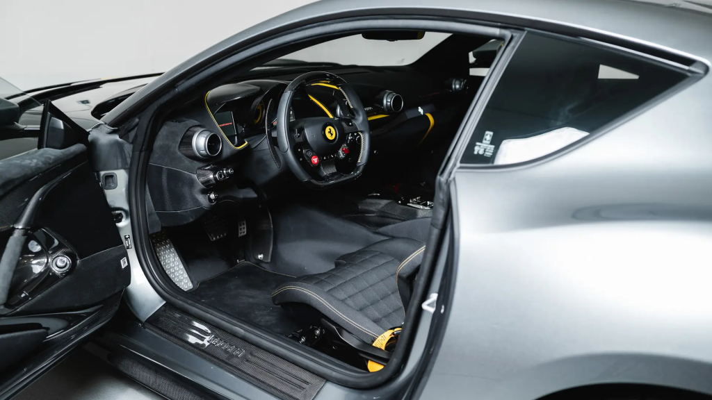 ZFF03TMB000302270 : 2023, 812/Comp., moteur 563056, jantes monobloc carbone 20″, étriers jaunes, système de levage avant, écussons Scuderia sur les ailes, Grigio Competizione, bande Giallo Fly à liserés Nero, alcantara noir à passepoils jaunes,