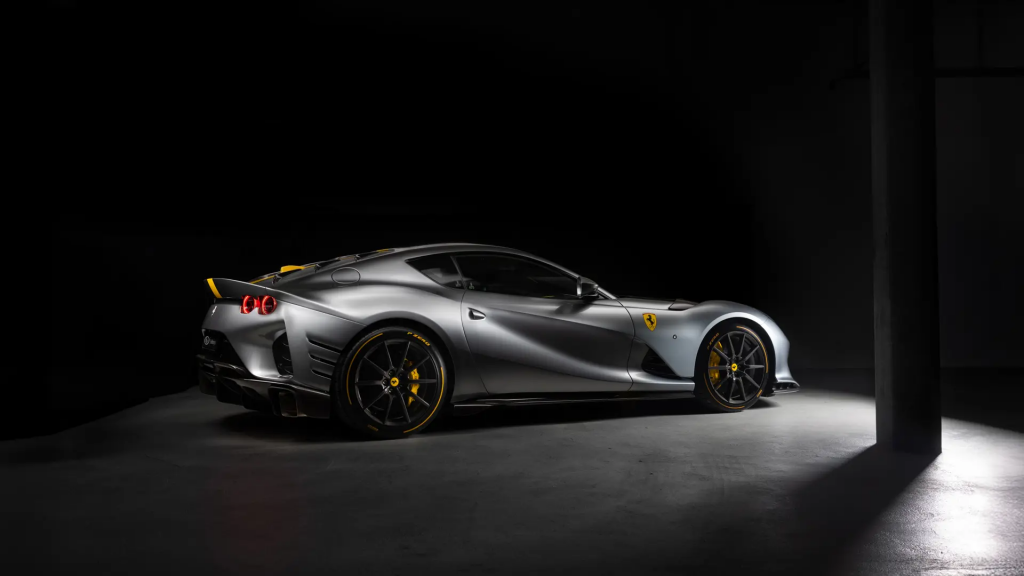 ZFF03TMB000287558 : 2022, 812/Comp., jantes noir mat, étriers noirs ; système de levage av.; diffuseur arrière, ouïes av., poignées de portes intérieures, dessus de tableau de bord, lunette arrière, dessus de console centrale carbone ; sièges Daytona réglables en hauteur, emblème brodé dans les appuie-têtes, ceintures de sécurité Giallo, compteurs à fond Giallo, tapis de sol avec emblème Ferrari, Giallo Triplo Strato, alcantara noir à passepoils Giallo.