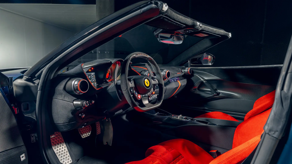 ZFF04TMB000299880 : 2024, 812/Comp., couvres culasses signés Charles Leclerc et Carlos Sainz, étriers rouges, Carbon Package, emblèmes Scuderia sur les ailes, sièges Daytona larges avec emblèmes brodés Grigio Chiaro; Blu Pozzi, bandes Argento Nürburgring, alcantara Nero/Rosso.
