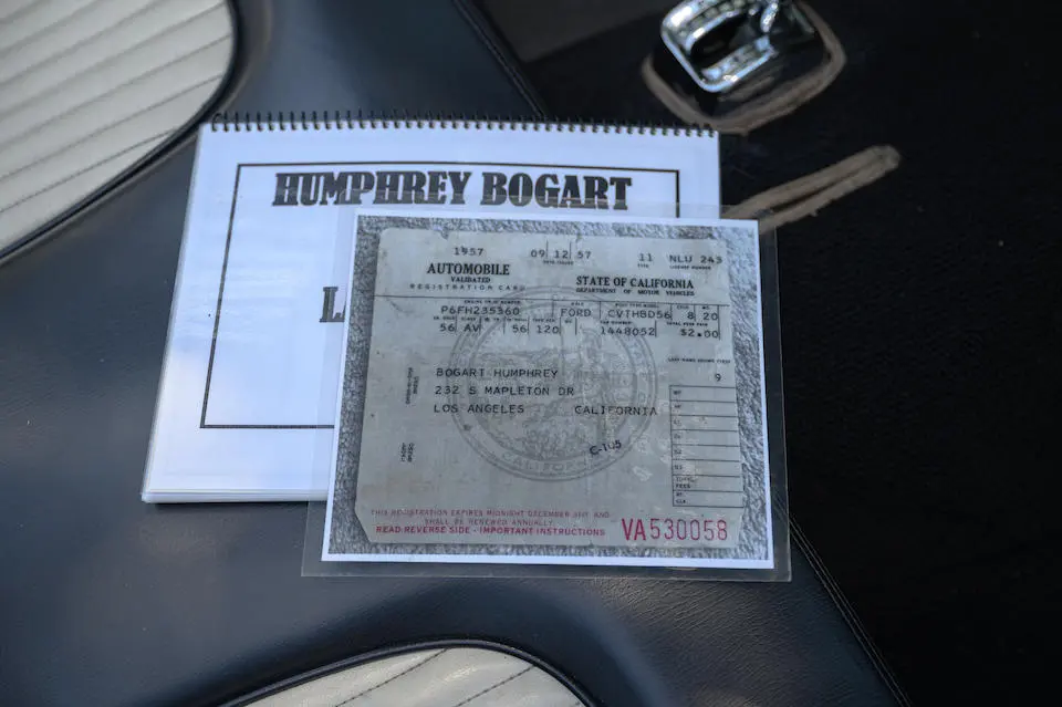 20/03/1956 : Vendue Humphrey Bogart, 236, S. Mapleton Drive, Beverly Hills, Los Angeles, Calif, (USA), via Bill Heath Ford, N. Hollywood, Los Angeles, Calif. (USA), reprise Jaguar XK120, puis son épouse Lauren Bacall (1957).
