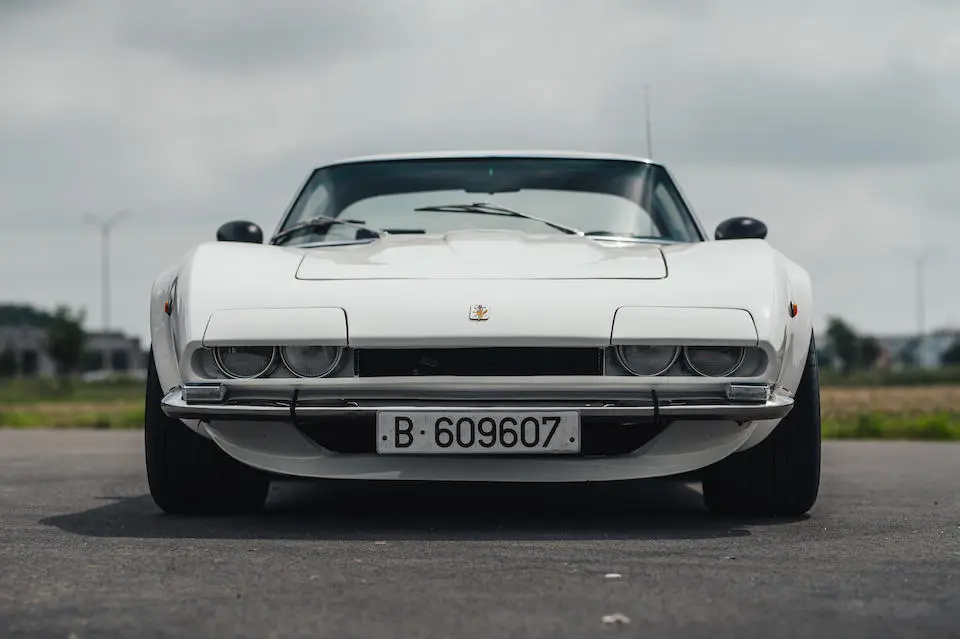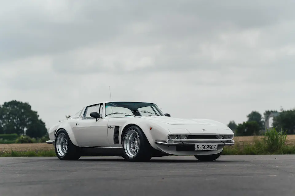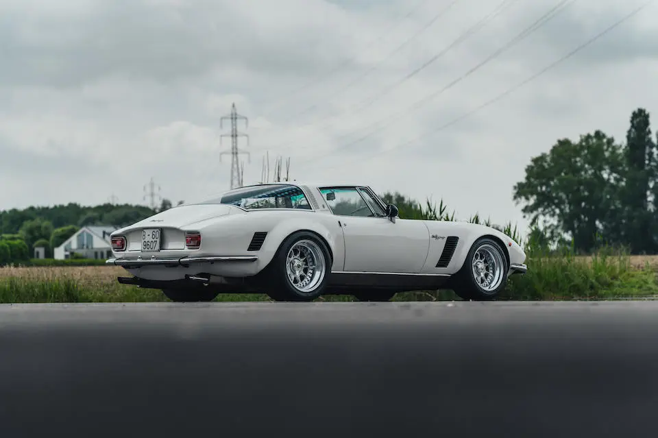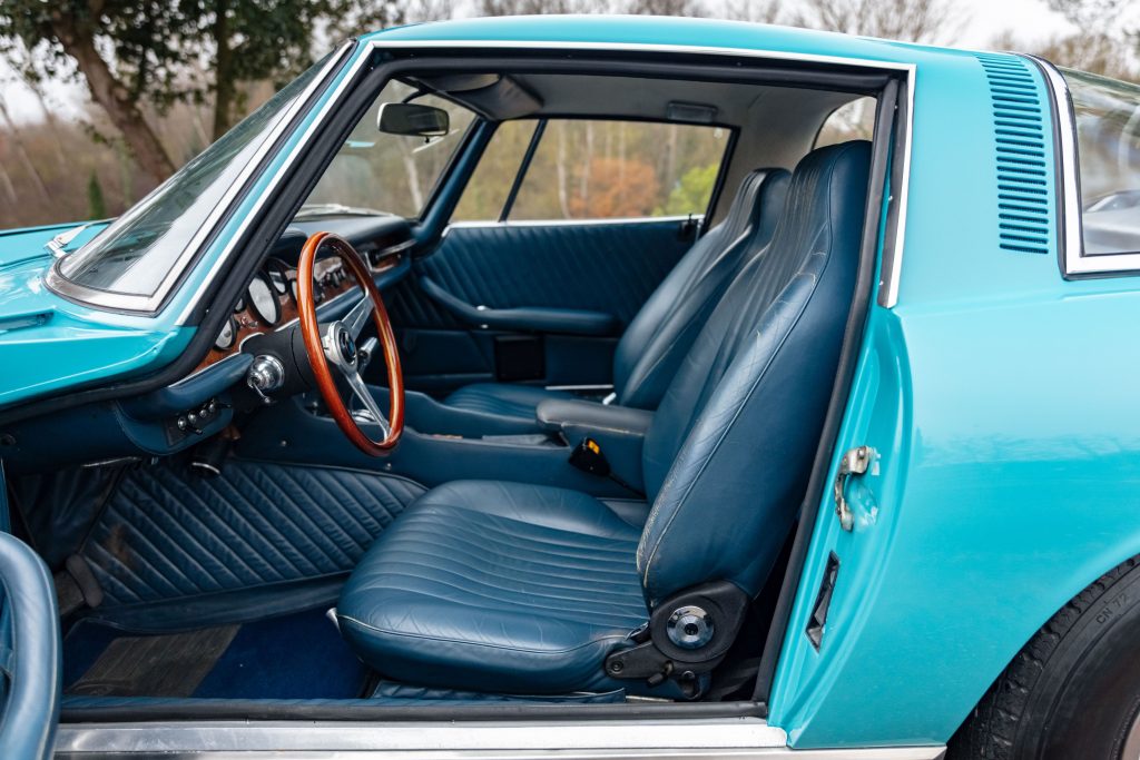 GL050.336 : 10/1970, Grifo GL, prototype de la Série II (IR8), 1/17 S2, la première avec phares carénés, moteur Chevrolet 350 ci et 350 ch. SAE, la 1ère avec phares carénés, volant bois, script Iso Rivolta au centre de la planche de bord avec déplacement de l’instrumentalisation, jantes alliage léger Campagnolo, radio Becker Mexico, boîte de vitesses manuelle 5 rapports ZF (1/23), Blanc Polo, cuir bleu.