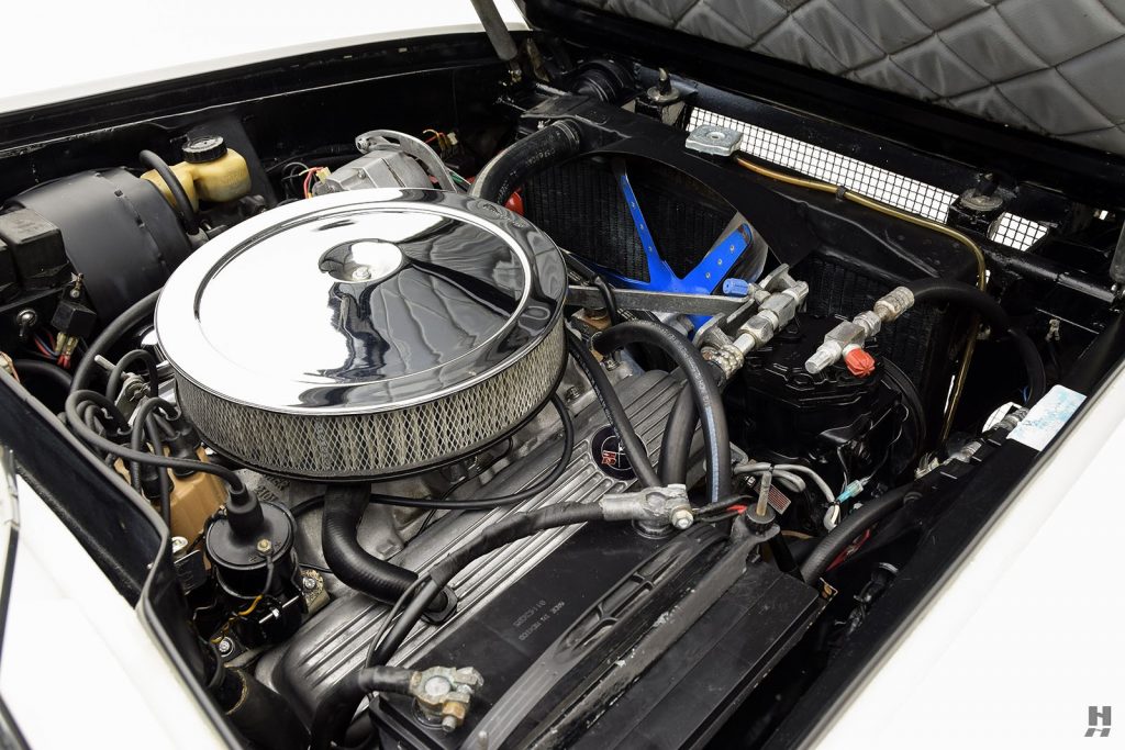 Moteur V8 Cobra Jet, 5762 cm3 (101,6×88,9), taux de compression : 8,6 :1, 360 ch SAE@5800, 48,3 Mkg@3800.
