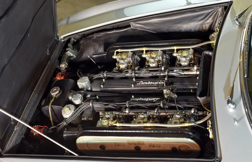 Moteur V12 ouvert à 60° entièrement en alliage léger, étude de Bizzarini finalisée avec Stanzani et Dallara. Bloc entièrement en alliage léger.