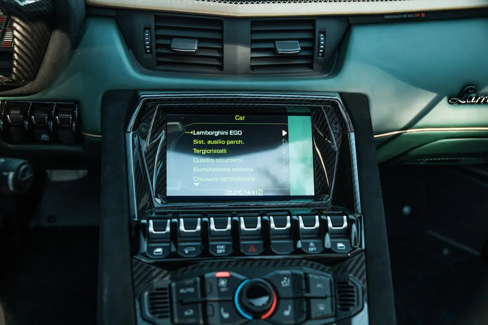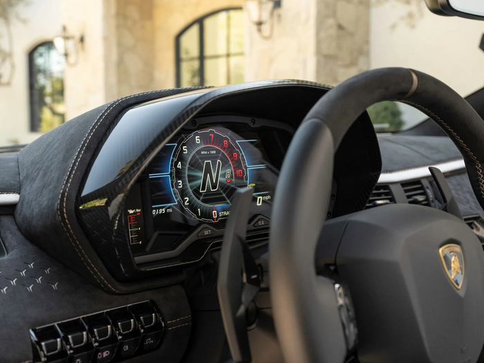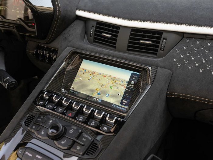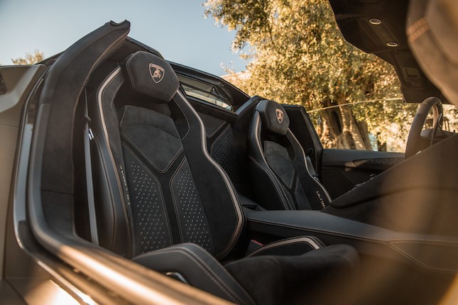 Habitacle repris de l’Aventador avec recourt au carbone pour les garnitures.