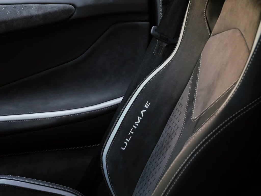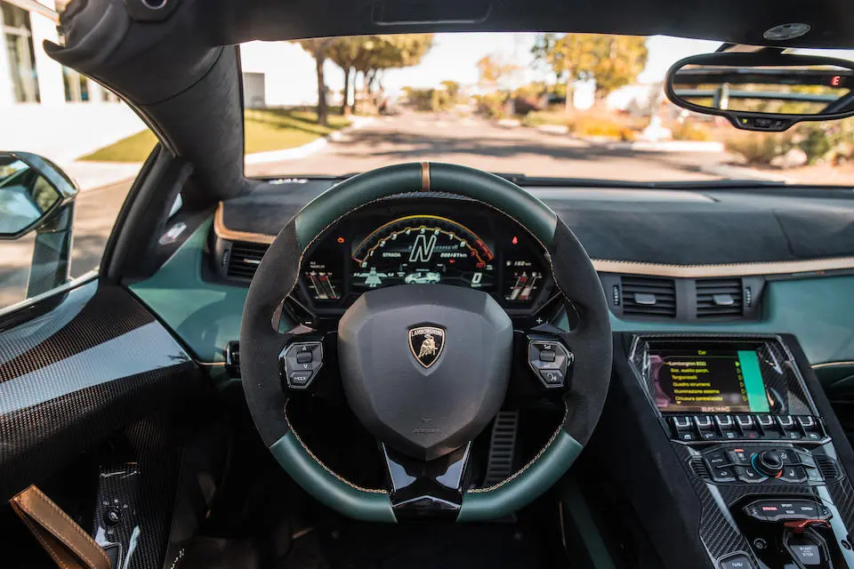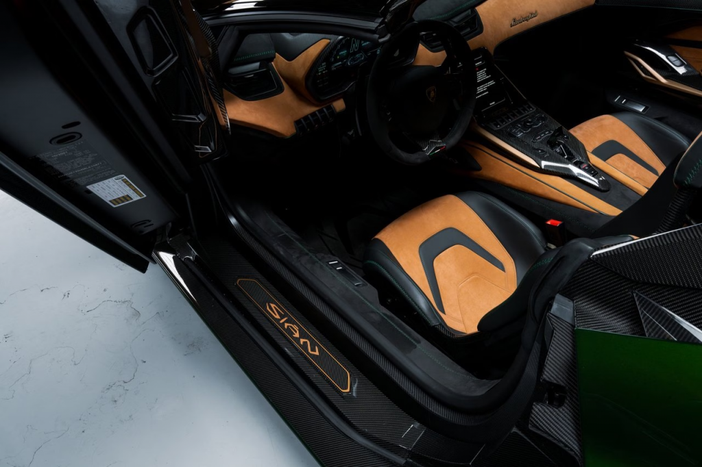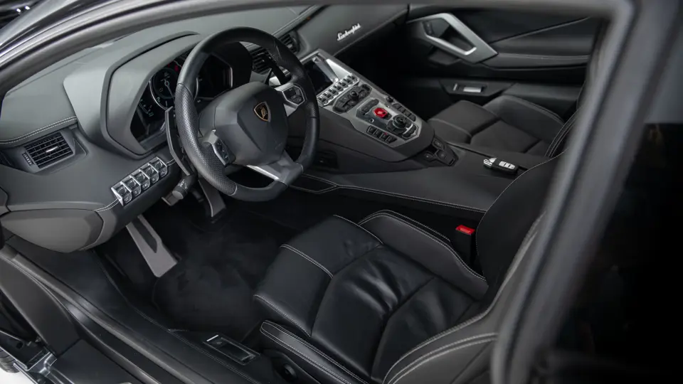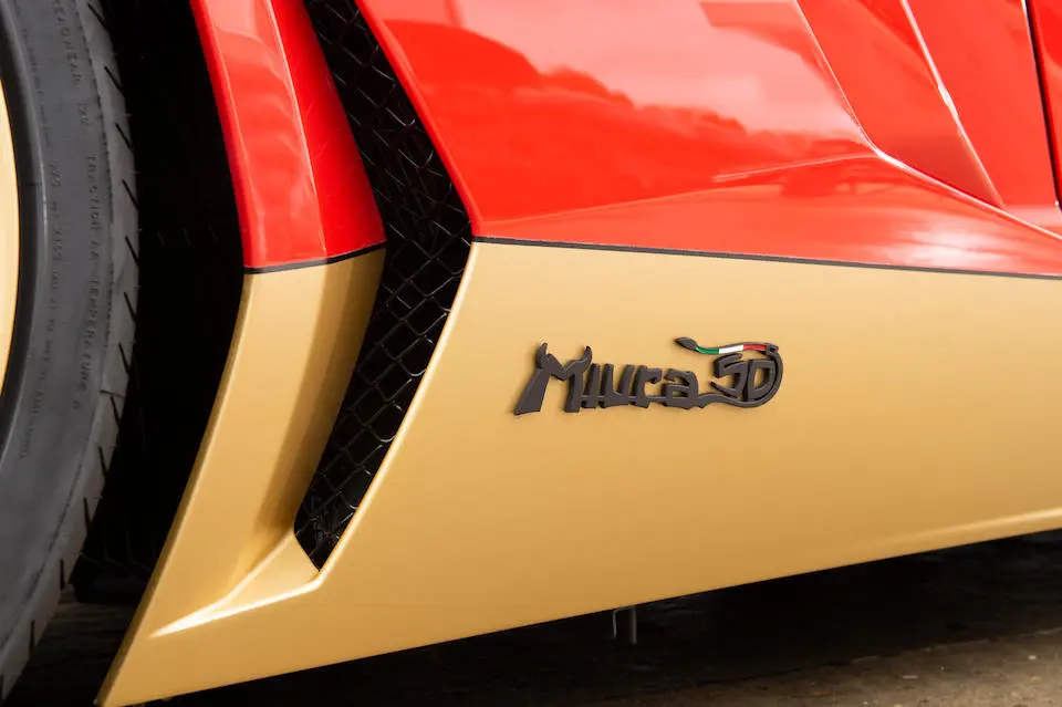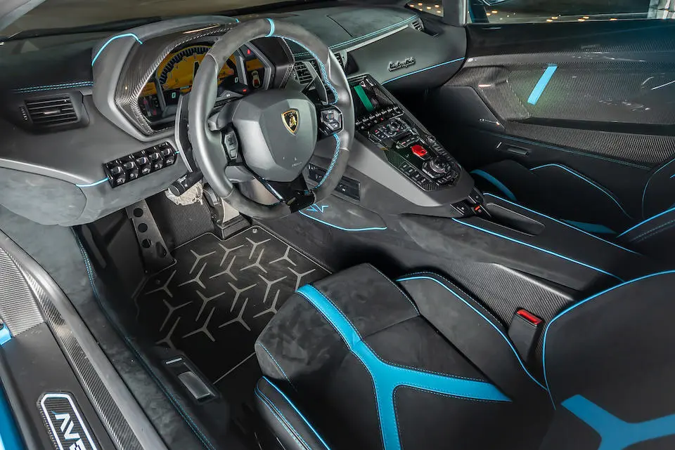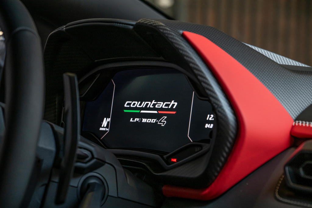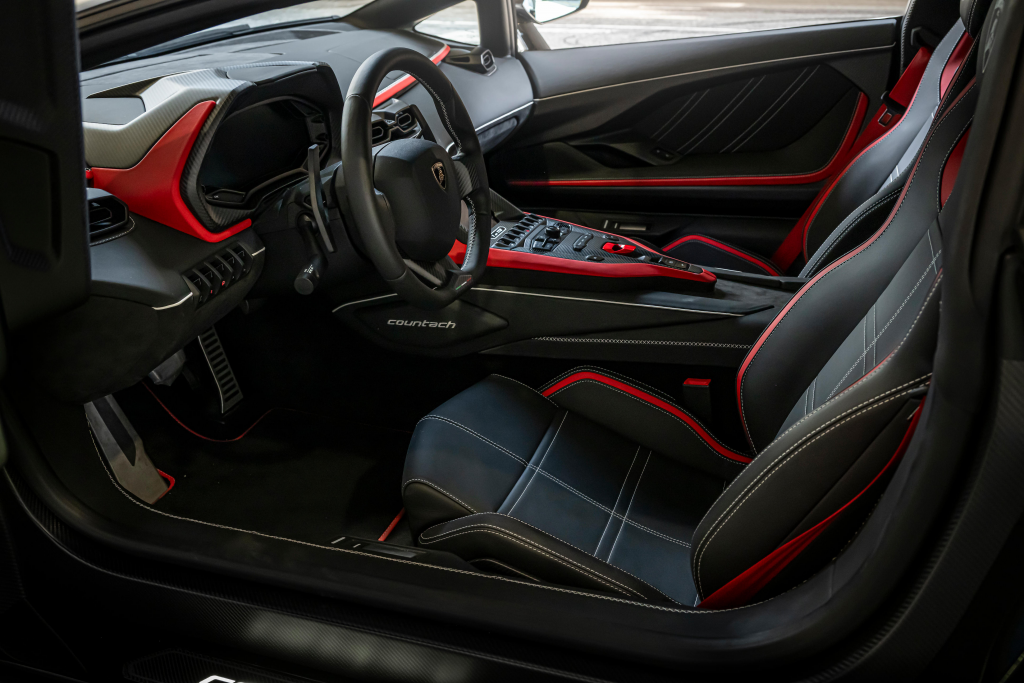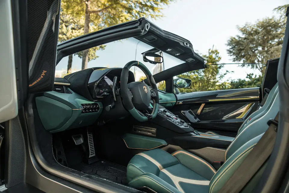 Intérieur cuir et carbone, sièges chauffants, aide au parking, caméra de recul, plaque commémorative dans l’habitacle, et logo Miura 50 sur le haut des sièges et les seuils de portes.