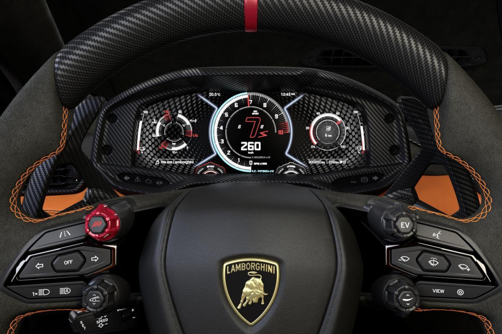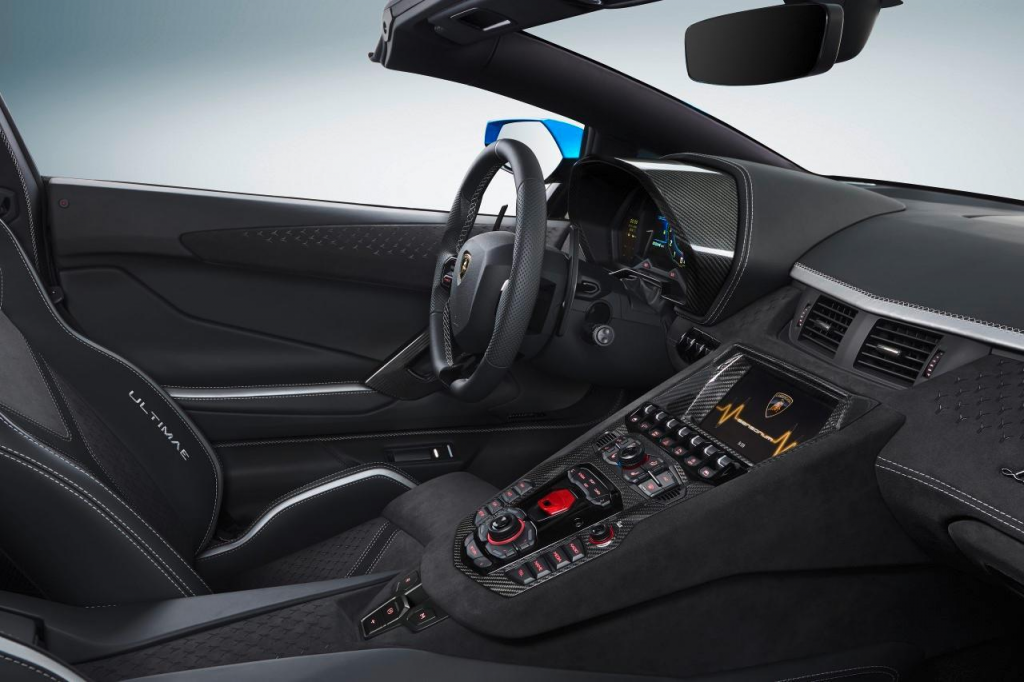 La voiture conserve l’ouverture des portes en élytre et un petit rangement à l’avant (112 l) plus grand que celui de l’Aventador. Le toit à double bossage permet d’augmenter l’espace passager intérieur, de même que la console centrale moins volumineuse.