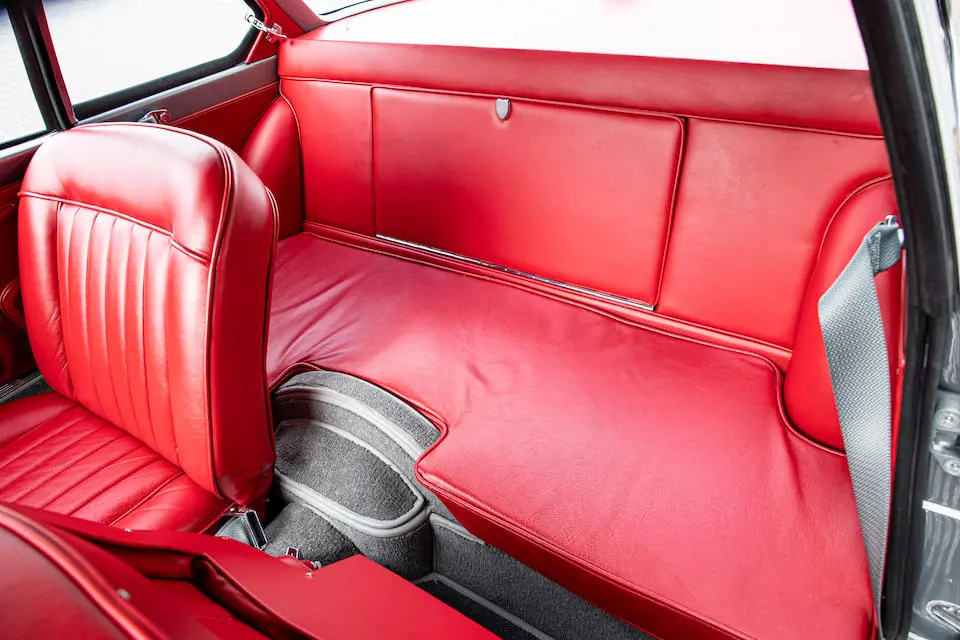 Grigio Metallizzato, cuir sang de bœuf, tapis de sol gris, phares longue portée Carello, amortisseurs Koni.