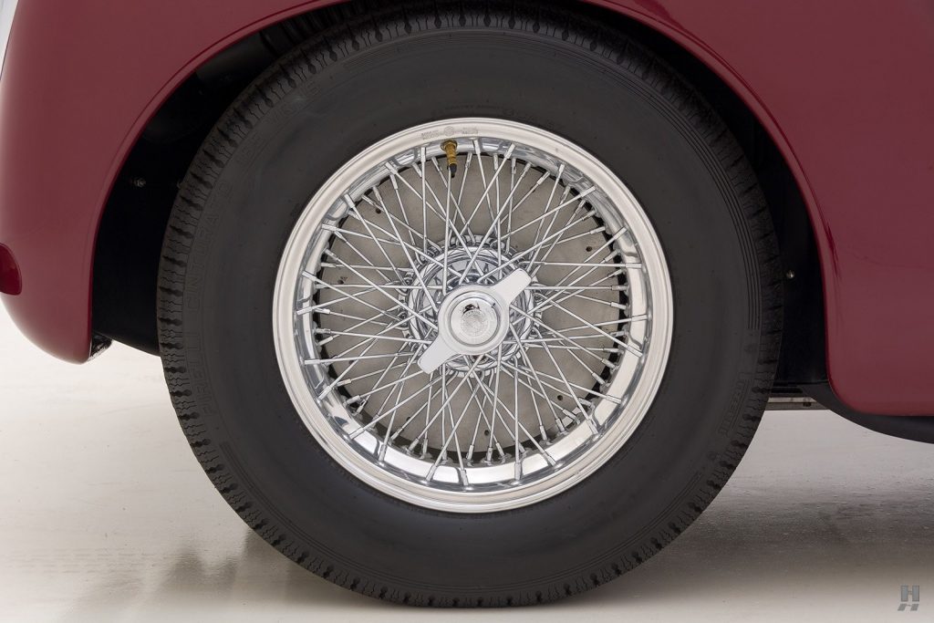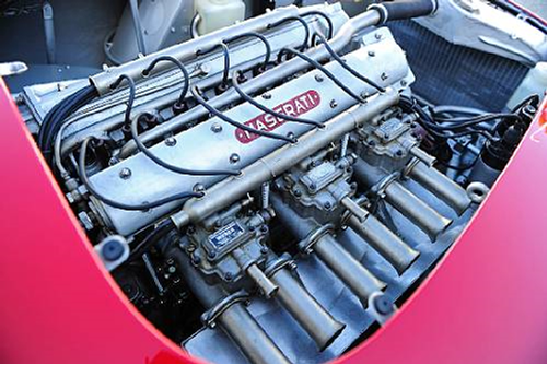 1954 : Salon de Paris (FRA) : Présentation d’un coupé Frua A6G/54 : ce modèle reprend le moteur GCS étudié pour la compétition par Colombo et modifié par l’ingénieur Vittorio Bellentani pour un usage routier (abandon de la lubrification par carter sec, entrainement de distribution par pignons remplacée par une chaîne plus silencieuse, double allumage décalé des 2 bougies d’un même cylindre et non plus simultané par allumeur Marelli à doigt unique et contacts jumelés placé en bout d’arbre à cames –pas toujours monté-, ordre d’allumage : 1-1, 5-5, 3-3, 6-6, 2-2, 4-4, taux de compression abaissé à 8 :1). 150 chevaux à 6000 tours (avec double allumage). Alimentation par 3 carburateurs double corps Weber 40 DCO3.