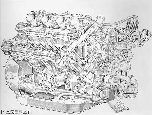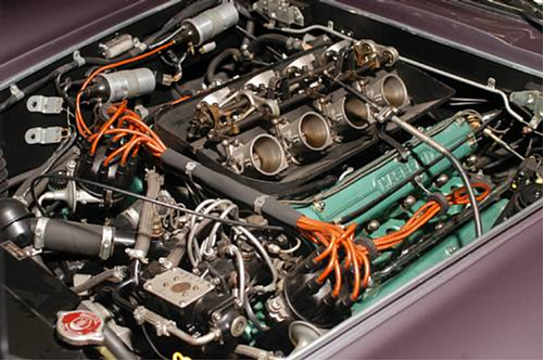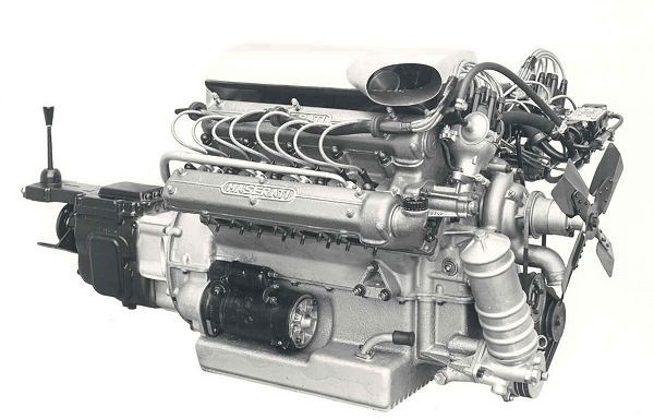 04/1961, Salon de Turin (ITA) : # AM 103008 : 3e voiture : 4941 cm3 (94×89) par réduction de l’alésage et augmentation de la course. Injection indirecte Lucas. Remplacement de la cascade de pignons par une chaîne triple pour l’entraînement des arbres à cames, 345 chevaux à 5500 tours.