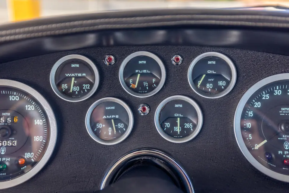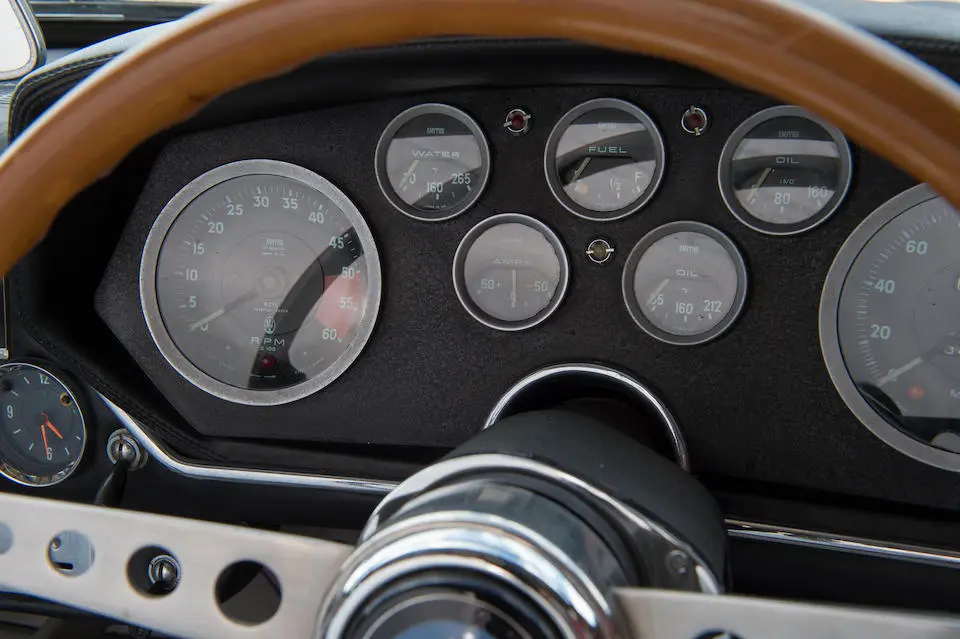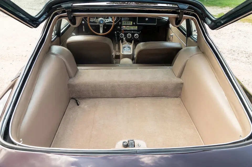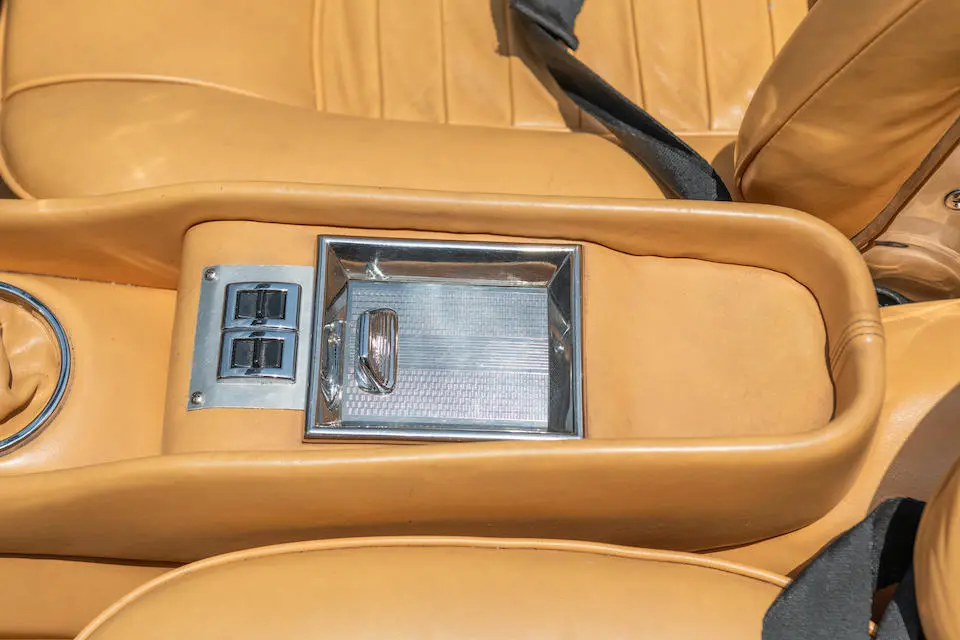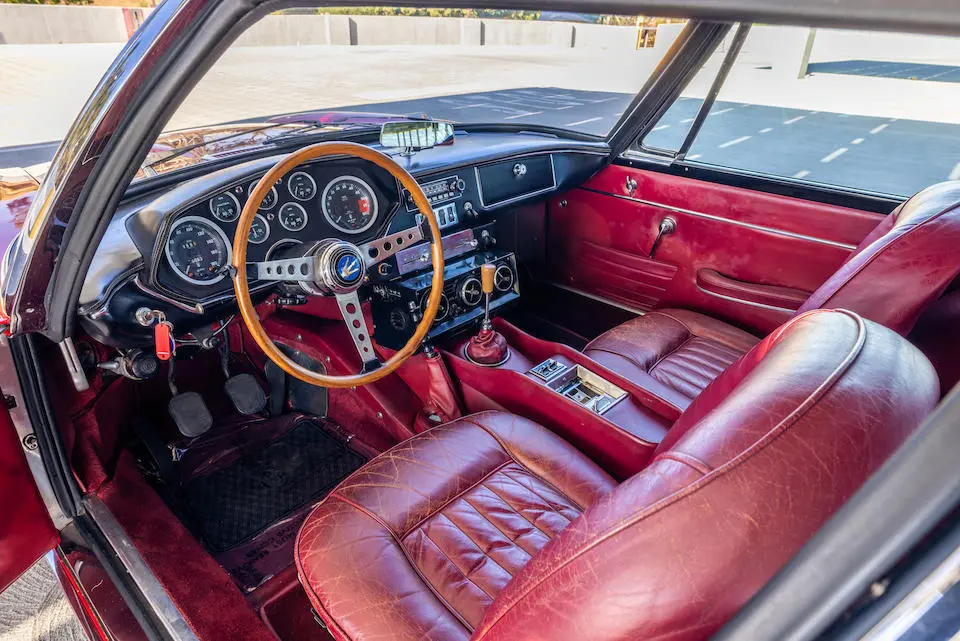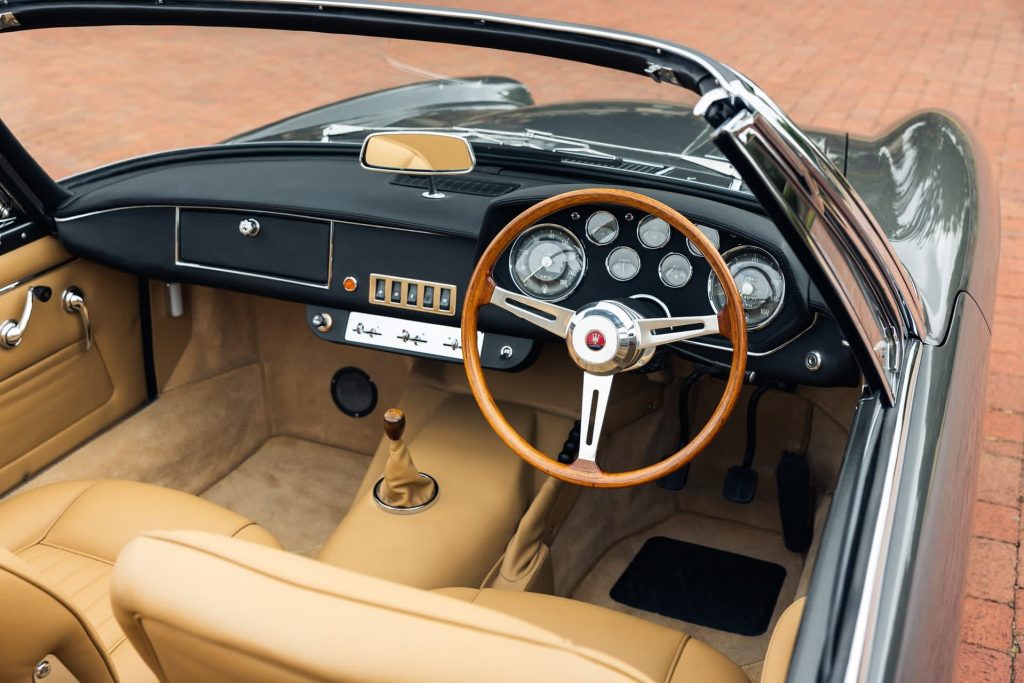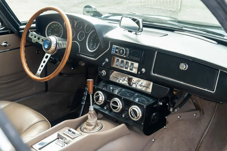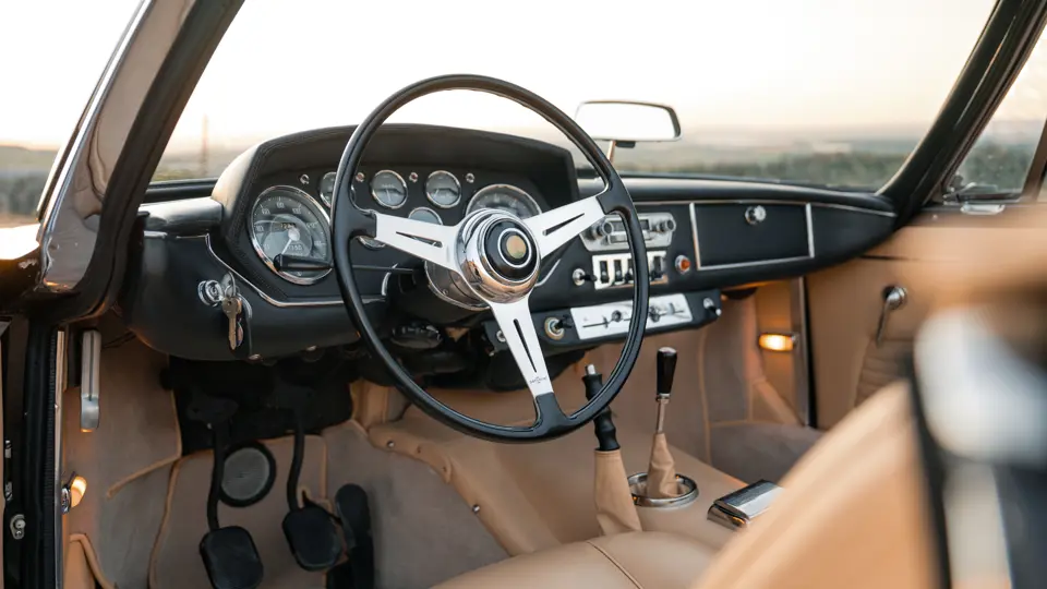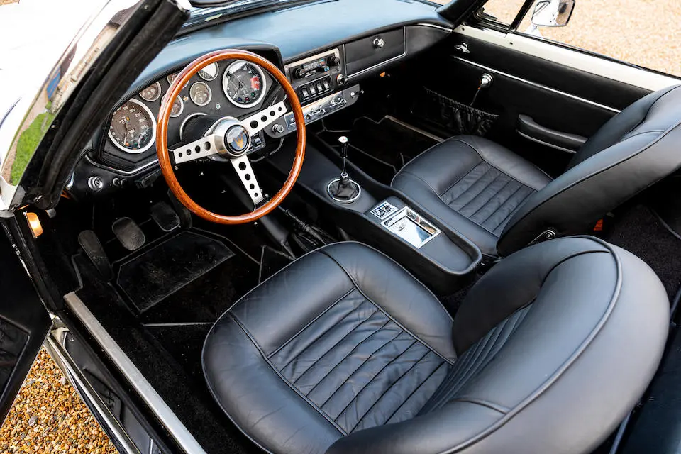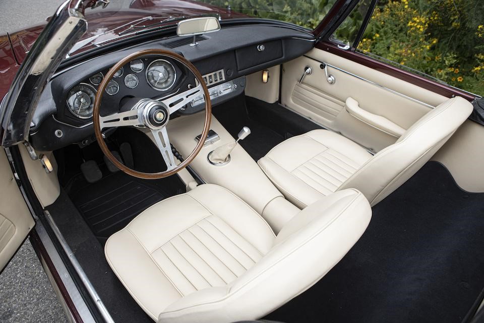 AM 109/S/A1/611: 03/1966, 4 litres Spider, cuir brun, jantes à rayons Borrani, coussins de sièges arrières spéciaux, hardtop, robinet de réserve d’essence, vitres électriques, boîte à gants, poignée de maintien passager sur la planche de bord, bacs de portes, avertisseur « ville », porte passager blocable par clé, ancrages de crochets de remorquage avant et arrière, cendrier sous le volant, ceintures de sécurité, appuie-tête passager, prises d’air latérales, radio et haut-parleurs Autovox, antibrouillards, montre électrique, glaces latérales teintées bleu, essuie-glaces spéciaux.