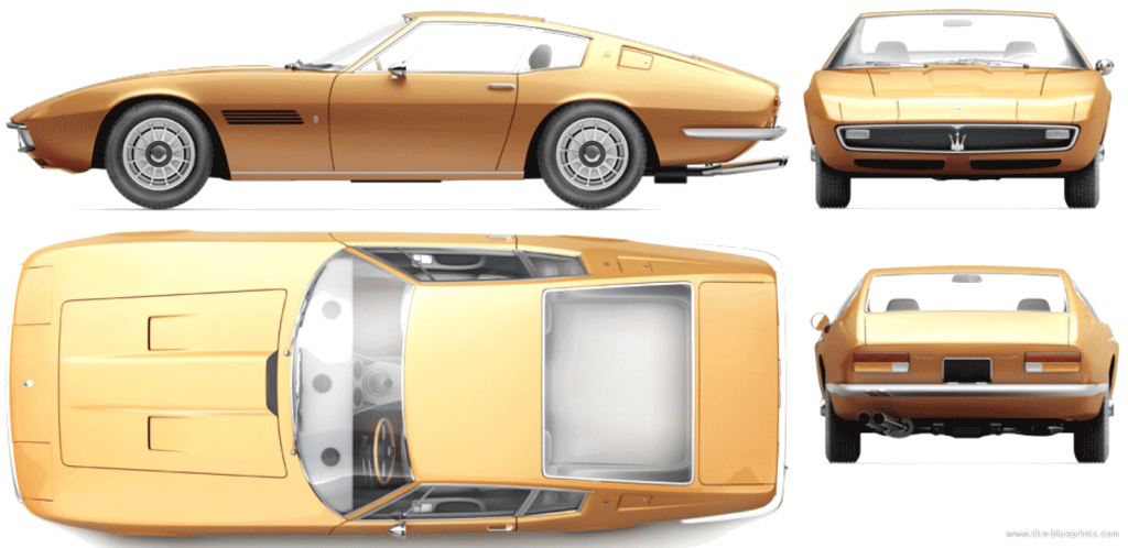 Une maquette grandeur nature est présentée à Omer Orsi, président de Maserati, dans les ateliers de la carrosserie Ghia. le dessin est du à Giorgetto Giugiaro (transfuge de Bertone ou il a contribué au dessin de la Lamborghini Miura) et se caractérise par un long capot bas et large et des phares sous caches basculants, large pare-brise bombé et petite vitre de custode arrière pour améliorer la luminosité dans la voiture et glaces latérales en trapèze. Conducteur et passager sont installés très en arrière dans la voiture qui est conçue par l’ingénieur Giulio Alfieri. Orsi donne son accord pour la mise en production de cette nouvelle GT qui est présentée au Salon de Turin (ITA) en Octobre 1966 sous le nom de Ghibli (Tipo AM 115). Livraisons à partir du printemps 1967 sous le nom de Ghibli qui est un vent violent du désert égyptien. La Ghibli se pose en concurrente directe des Ferrari et Lamborghini dans le crénea u des GT exclusives.