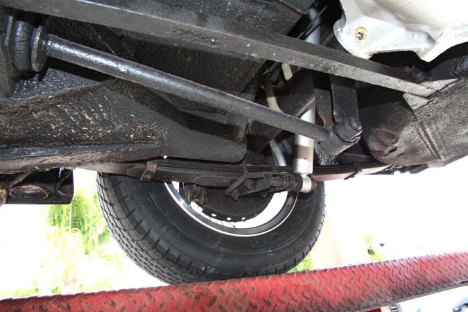 Suspension arrière avec un essieu rigide guidé par des ressorts semi-elliptiques à lames.