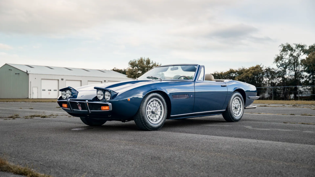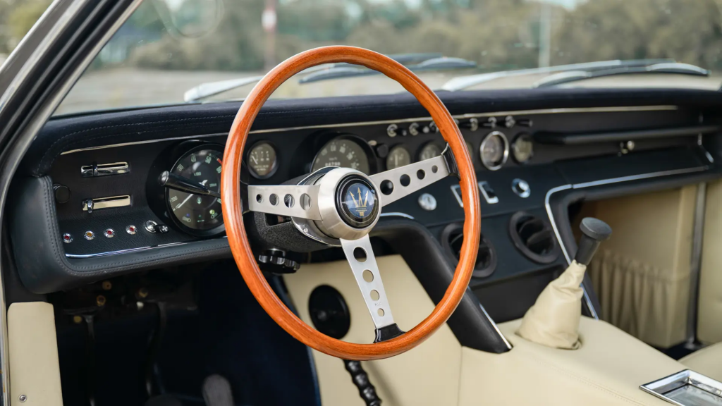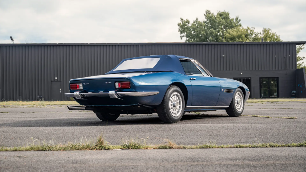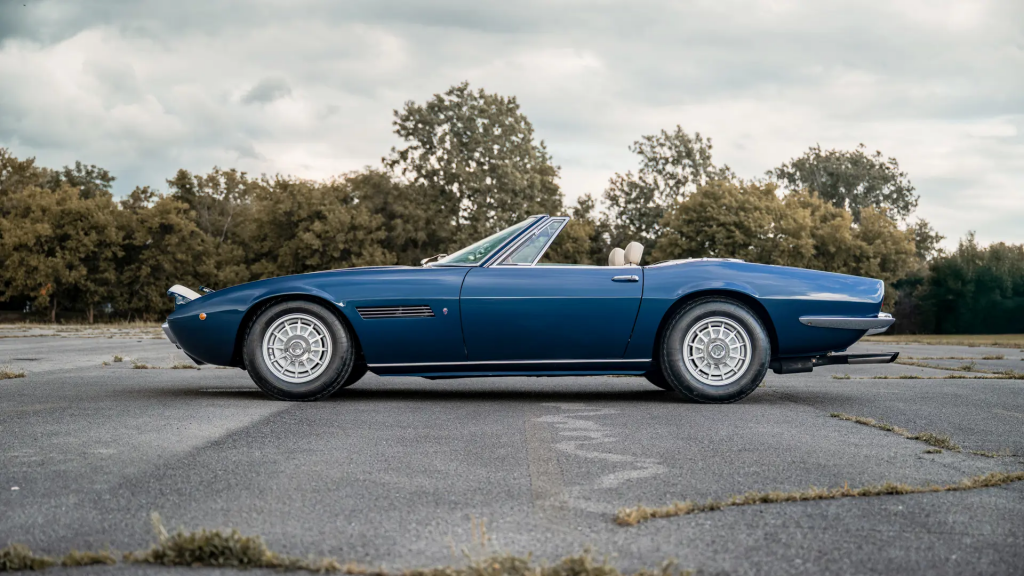 AM 115/S/1001 : 1968, Spider, prototype de la série, 4,7 l, Giallo, cuir Testa di moro (brun foncé), pli de tôle au niveau de la poignée de porte, pas de trappe d’ouverture de réservoir d’essence sur l’aile arrière, les embouts sont placés dans le coffre. Arrière plus long que les modèle suivants, antenne de radio à l’arrière de l’aile, badges Maserati et Ghibli sur la partie arrière gauche de la voiture (séparés des 2 côtés sur les modèles de série). Culasses avec fonderie prévue pour un éventuel montage de double allumage.