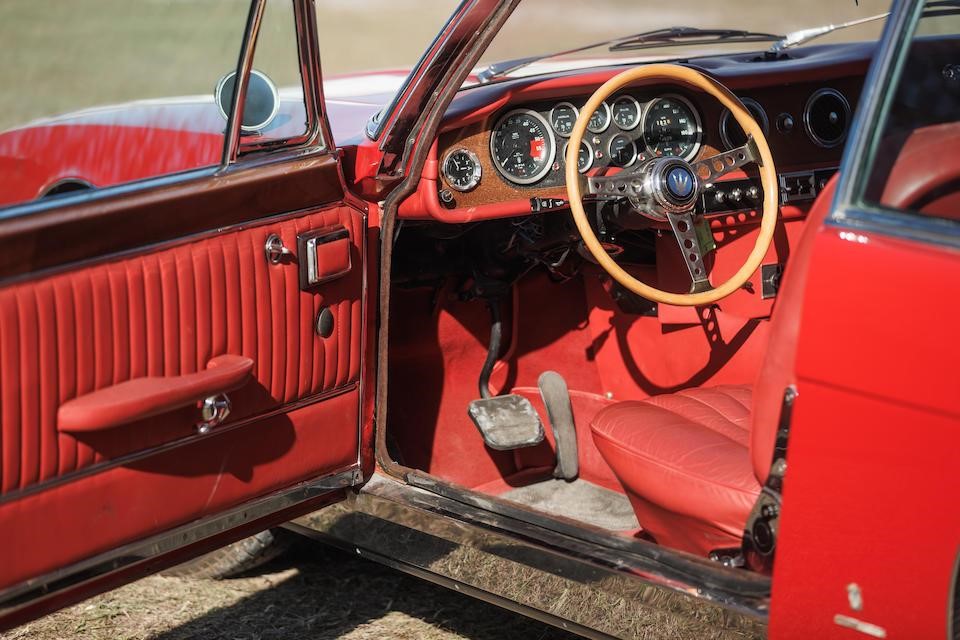 AM 112 001 : 1967, Prototype par Frua, 1ère de la série, avec le 1er moteur 4,7 litres, phares, vitres de custode arrière différents de la série, jantes à rayons chromés Borrani, Amaranto, cuir naturel.
