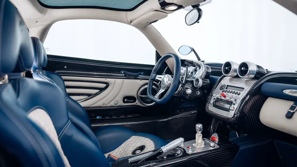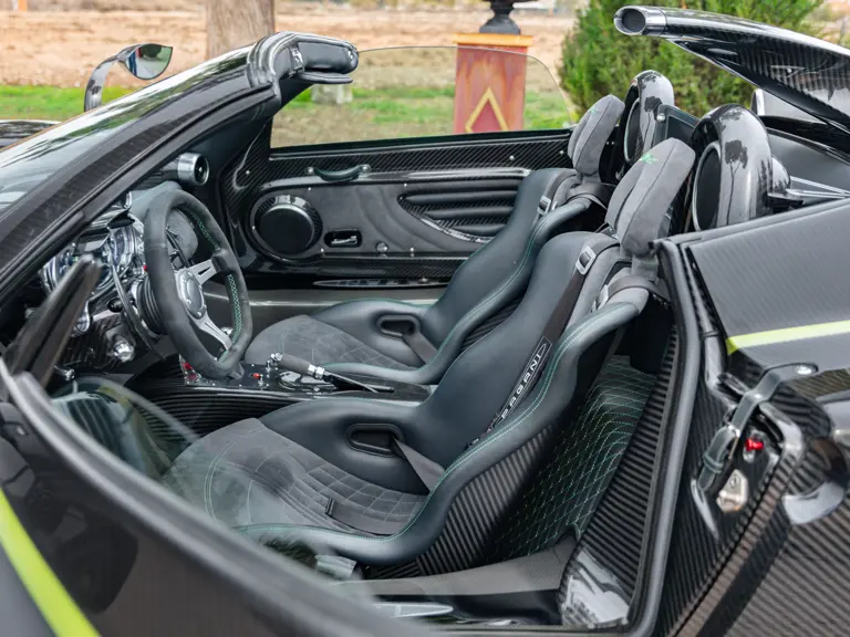ZA9C82OC110F76131 : 2017, Roadster Aether, sur châssis existant en carbone et titane, moteur 750 ch, boîte manuelle à 6 rapports, harnais 4 points, ouverture des portes par lanières en cuir noir, compte-tours LED, logos Aether, Noire, filets rouges, baquets de Barchetta/Huayra, cuir noir à passepoils rouges.