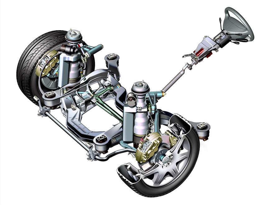 Suspensions avec amortisseurs à air comprimé pilotés électroniquement AIRMATIC DC à 3 lois de tarage.